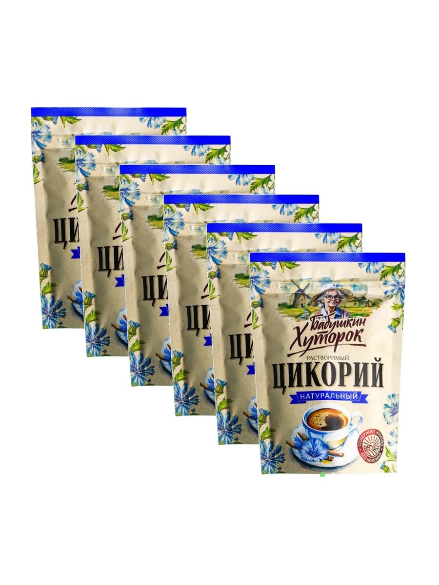 Set of 6 pieces. Total weight: 600 g. Babushkin Khutorok, Natural Instant Chicory, 100 g. Chicory is rich in vitamins and microelements essential for the normal functioning of the human body. Inulin, contained in chicory, improves metabolism, normalizes digestion, and significantly reduces toxin and waste levels.
