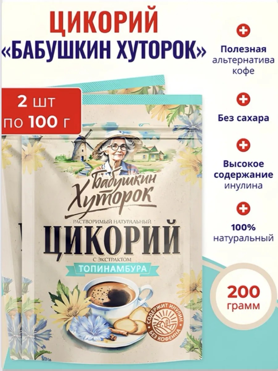 Цикорий Бабушкин Хуторок с экстрактом топинамбура поможет вам взбодриться без вреда для организма. 100 % натуральный цикорий обладает насыщенным ореховым ароматом и ярким вкусом, напоминающим кофейный напиток. Растворимый цикорий не содержит кофеин и отлично подходит в качестве альтернативы кофе для беременных и кормящих мам. Благодаря высокому содержанию инулина способствует нормализации обмена веществ. Чашка цикория притупляет чувство голода, снижает аппетит и нормализует уровень сахара в крови. Цикорий - низкокалорийный продукт, за счет чего является идеальным для похудения. Порошкообразный цикорий подходит для приготовления горячих напитков с молоком и сливками, можно добавить мёд, сахар, лимон или корицу по вкусу. Не отказывайте себе в любимом американо, капучино или латте, просто замените в нем кофе на цикорий.