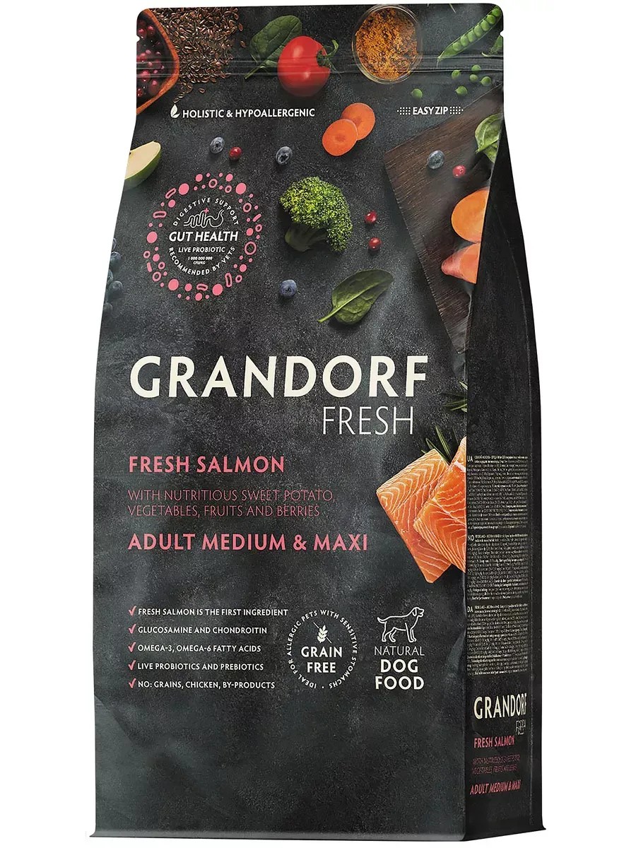 Корм Grandorf Fresh Holistic Medium Maxi Salmon Sweet Potato (беззерновой) для собак средних и крупных пород, свежее мясо лосося с бататом, 1 кг Беззерновой корм с живыми пробиотиками. Для взрослых собак средних и крупных пород, для здоровья кожи и шерсти или склонных к аллергии. Свежее гипоаллергенное и питательное филе лосося благотворно влияет на пищеварительную систему собаки. Благодаря правильно подобранным ингредиентам, а также сбалансированному содержанию омега-3 и 6 жирных кислот корм имеет отличную усвояемость, высокую пищевую ценность и поддерживает здоровье чувствительной кожи и шерсти собаки. В ОСНОВЕ КОРМА: Свежее филе лосося основной источник животного белка. Филе лосося богато незаменимыми аминокислотами и поразит даже самого искушенного питомца своим незабываемым вкусом и ароматом. Батат основной источника углеводов и клетчатки. Легко усваиваемый, богат множеством витамин и является отличной альтернативой зерновым кормам при пищевой непереносимости и аллергии. СВЕЖЕЕ МЯСО БЕЗ КОСТЕЙ. Мы используем мясо высшего сорта, без костей и субпродуктов. Это гарантирует, что ваш питомец получает высокопитательный, легко усвояемый источник белка. БЕЗ ЗЕРНА И ГЛЮТЕНА. Благодаря беззерновому и безглютеновому составу наши корма легко усваиваются и отлично подходят для животных с чувствительным пищеварением или пищевой аллергией. ЖИВЫЕ ПРОБИОТИКИ. Наши корма содержат один миллиард живых и полезных пробиотиков на один килограмм корма. Пробиотики поддерживают микрофлору кишечника, помогают усвоению питательных веществ и укрепляют иммунитет. Пробиотики добавляются после производства в специальных кишечнорастворимых микрокапсулах, остаются живыми и выполняют свои функции: Улучшают усвоение питательных веществ Поддерживают полезную микрофлору и выводят токсины Снижают риск расстройства пищеварения Повышают иммунитет и устойчивость к болезням Не имеют побочных эффектов СМЕСЬ ФРУКТОВ И ОВОЩЕЙ