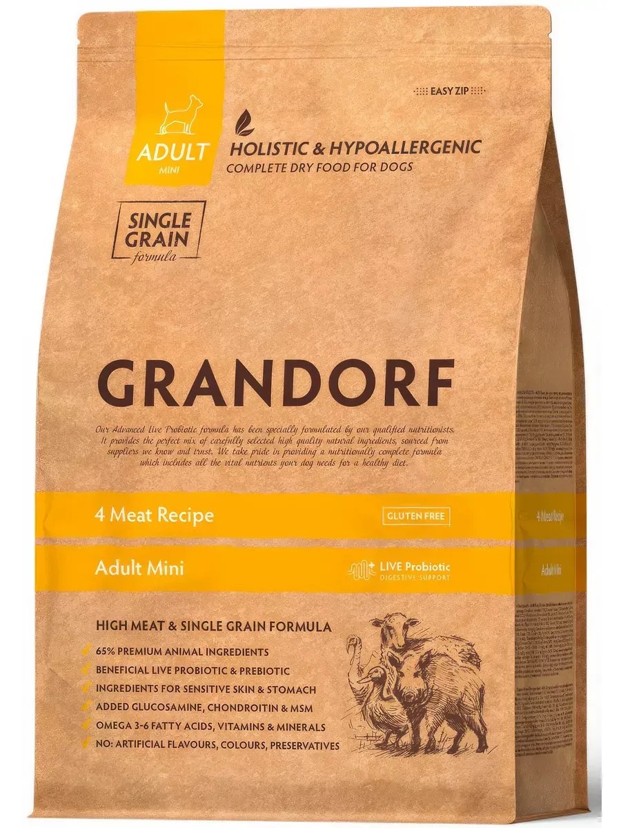 Корм Grandorf 4 Meat Recipe Mini Holistic Probiotic для собак малых пород, с ПРОБИОТИКАМИ, 4 вида мяса, 1 кг. Корм Grandorf 4 Meat Recipe Mini Holistic Probiotic для собак малых пород, с ПРОБИОТИКАМИ, 4 вида мяса Высокое содержание протеинов, полезных жиров, аминокислот и витаминов обеспечат необходимой энергией собак мелких пород. Миллиард живых пробиотиков ежедневно поддерживают микрофлору кишечника, улучшают пищеварение, усвоение питательных веществ и предотвращают аллергию. 65% мяса в составе 4 вида диетического мяса Живые пробиотики Низкозерновой состав Гипоаллергенные ингредиенты 27% белки, 15% жиры Не содержит: кукурузу, пшеницу, свеклу, горох, субпродукты, яйца, курицу, куриный жир, соль, сахар, красители, ароматизаторы, сою и ГМО. Тщательно отобранные, натуральные гипоаллергенные ингредиенты, помогают предотвратить аллергические реакции и пищевую непереносимость, обеспечивая иммунное и пищеварительное здоровье. Деликатный способ приготовления сохраняет все полезные свойства и питательные вещества натуральных ингредиентов обеспечивают отличное физическое состояние питомца