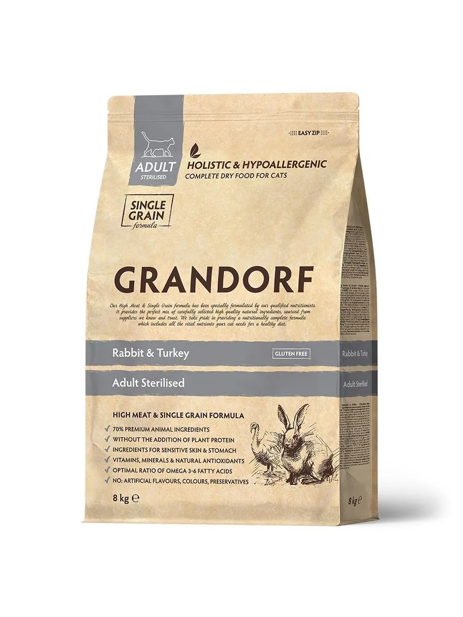 Корм для кошек Grandorf создан специально для поддержания здоровья вашего любимца после стерилизации. Этот корм для кошек сухой содержит два вида диетического мяса - кролика и индейку, что делает его отличным выбором для кошек с чувствительным пищеварением.