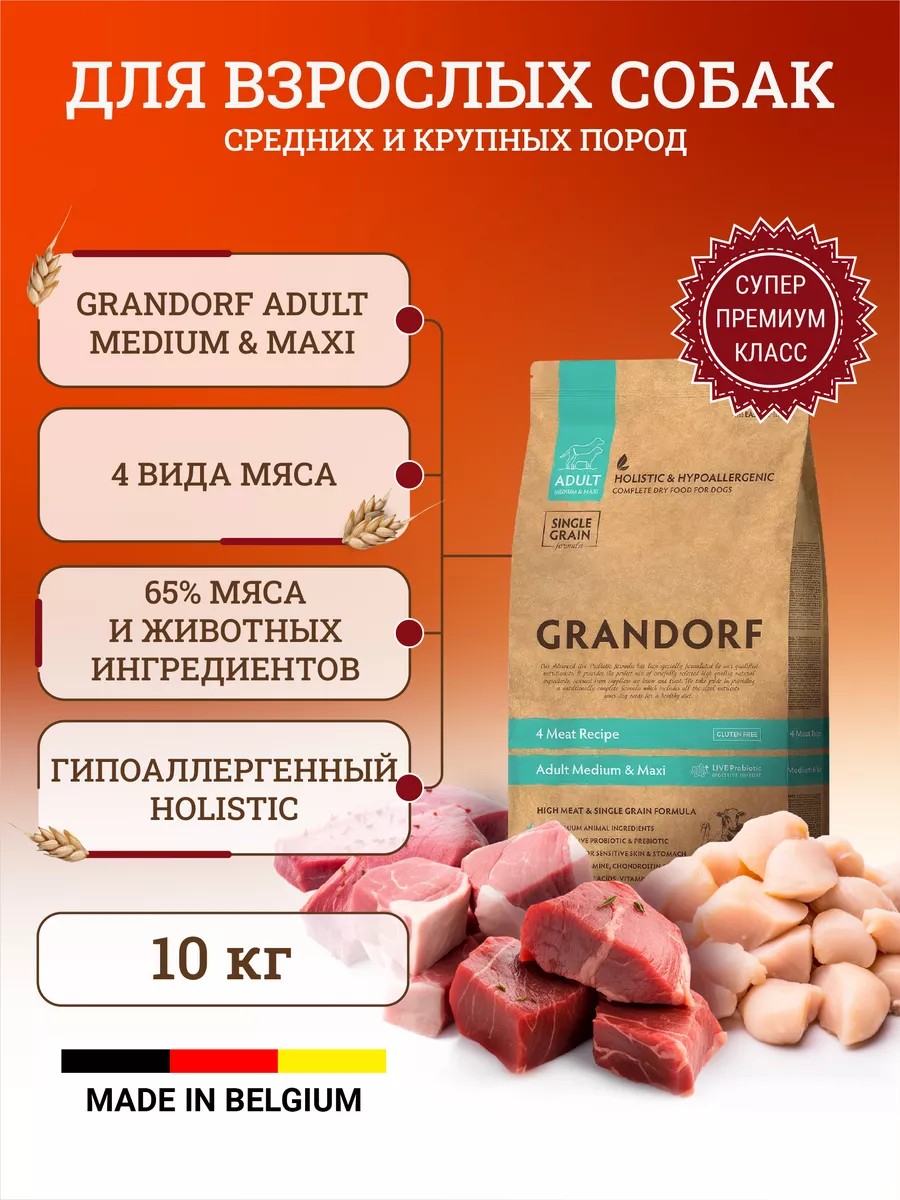 Grandorf сухой корм для взрослых собак средних и крупных пород – 4 вида мяса