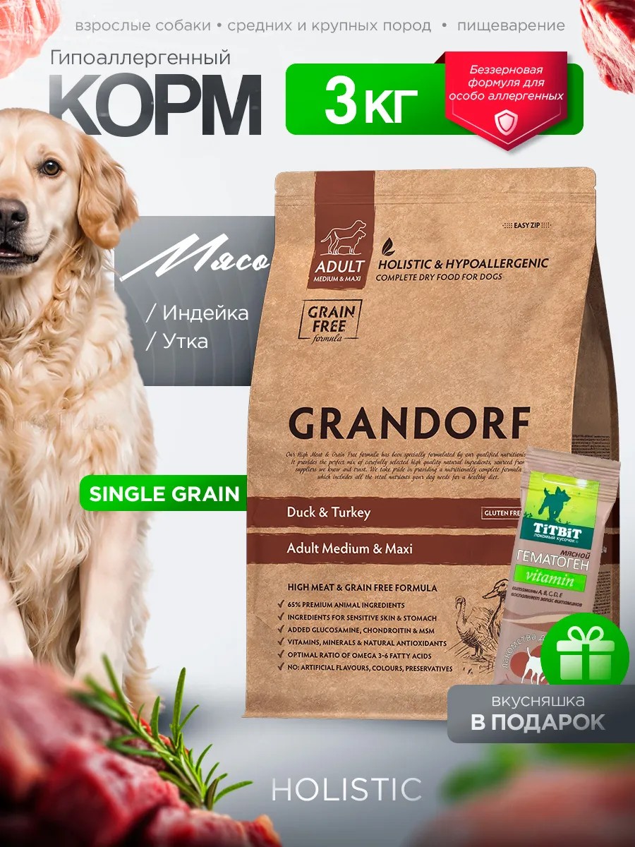 Grandorf Сухой корм для собак Medium & Maxi утка и индейка 3 кг