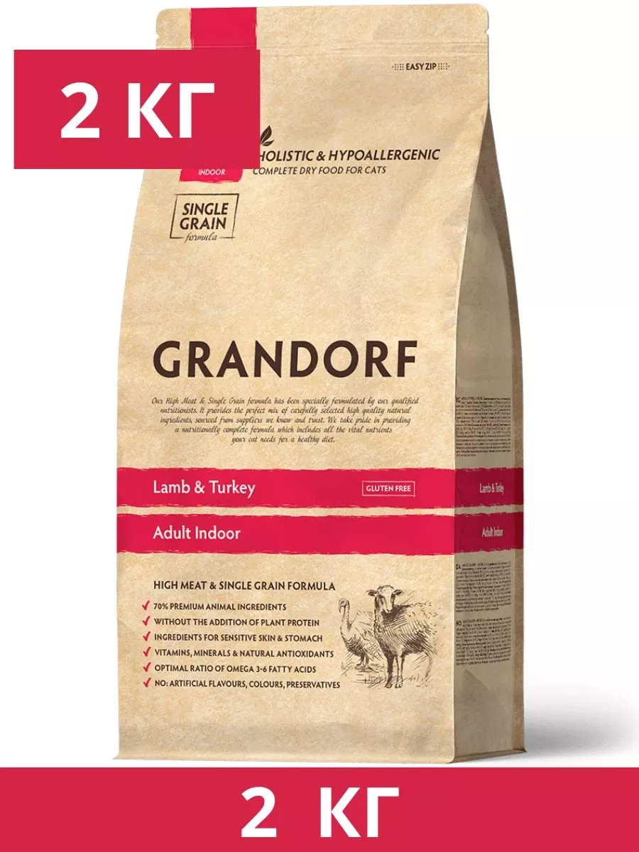 Grandorf Cat Lamb&Turkey Indoor Adult All Breeds. Корм сухой полнорационный для домашних взрослых кошек всех пород с нормальной активностью, чувствительным пищеварением или склонных к аллергии. Ягнёнок с индейкой, 2 кг.
