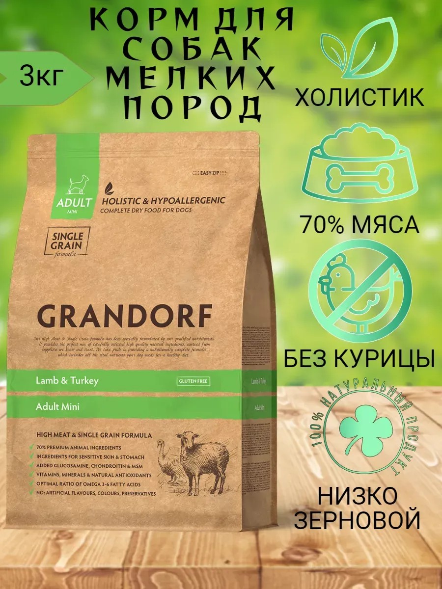 Корм GRANDORF для собак Для взрослых собак мелких пород с нормальной активностью, чувствительным пищеварением или склонностью к аллергии.Свежее гипоаллергенное и питательное мясо ягненка и постной индейки благотворно влияют на пищеварительную систему собаки. Благодаря гипоаллергенным ингредиентам, одному виду зерновых, отсутствию глютена, корм имеет отличную усвояемость, высокую пищевую ценность и помогает оставаться вашему питомцу здоровым и жизнерадостным на протяжении долгих лет жизни. Мы уделяем особое внимание качеству гранул в наших кормах. Они имеют однородную структуру, аппетитный вид и восхитительный аромат, без горечи, кислоты и прогорклости. Поэтому каждая гранула может служить лакомством для питомца.