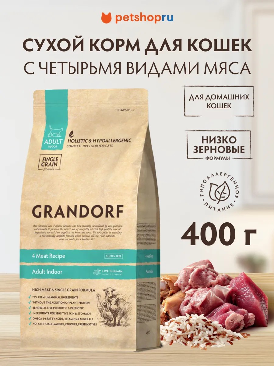 Grandorf корм для домашних кошек Четыре вида мяса Indoor, 0,4 кг