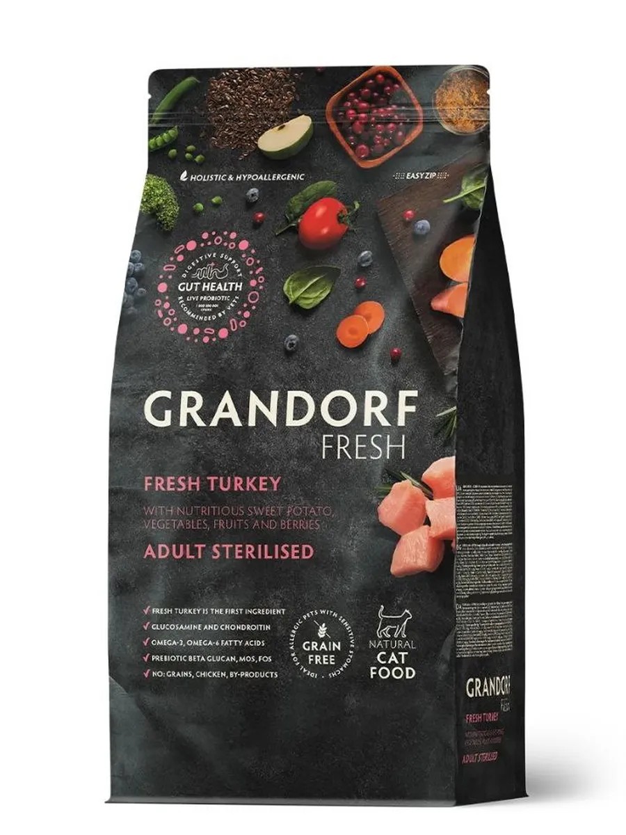 | Full product name | Grain-free food with live probiotics GRANDORF Fresh STERILISED Turkey and Sweet Potato (Fresh turkey meat with sweet potato for sterilized cats) 2 kg |