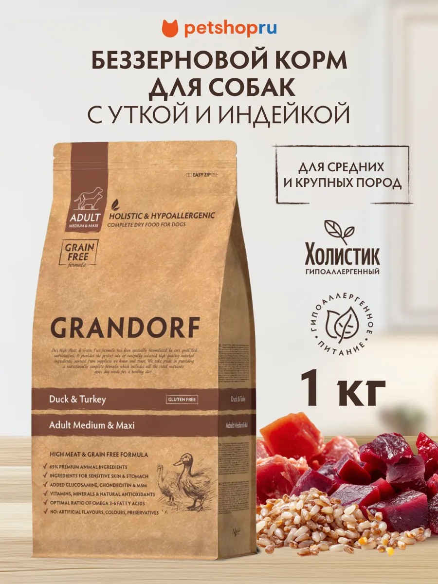 Grandorf корм для собак средних и крупных пород Утка с индейкой, 1 кг