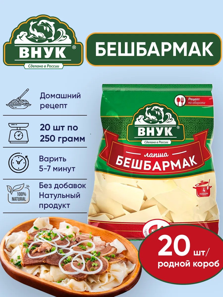 Каждая порция лапши Внук сделана из высококачественной муки, что обеспечивает ей отличную текстуру и вкус. Она идеально подходит для приготовления знаменитого бешбармака — блюда, которое сочетает в себе нежное мясо, ароматные специи и насыщенный бульон. Лапша легко варится и прекрасно удерживает соус, что делает ее идеальной основой для любого мясного блюда.