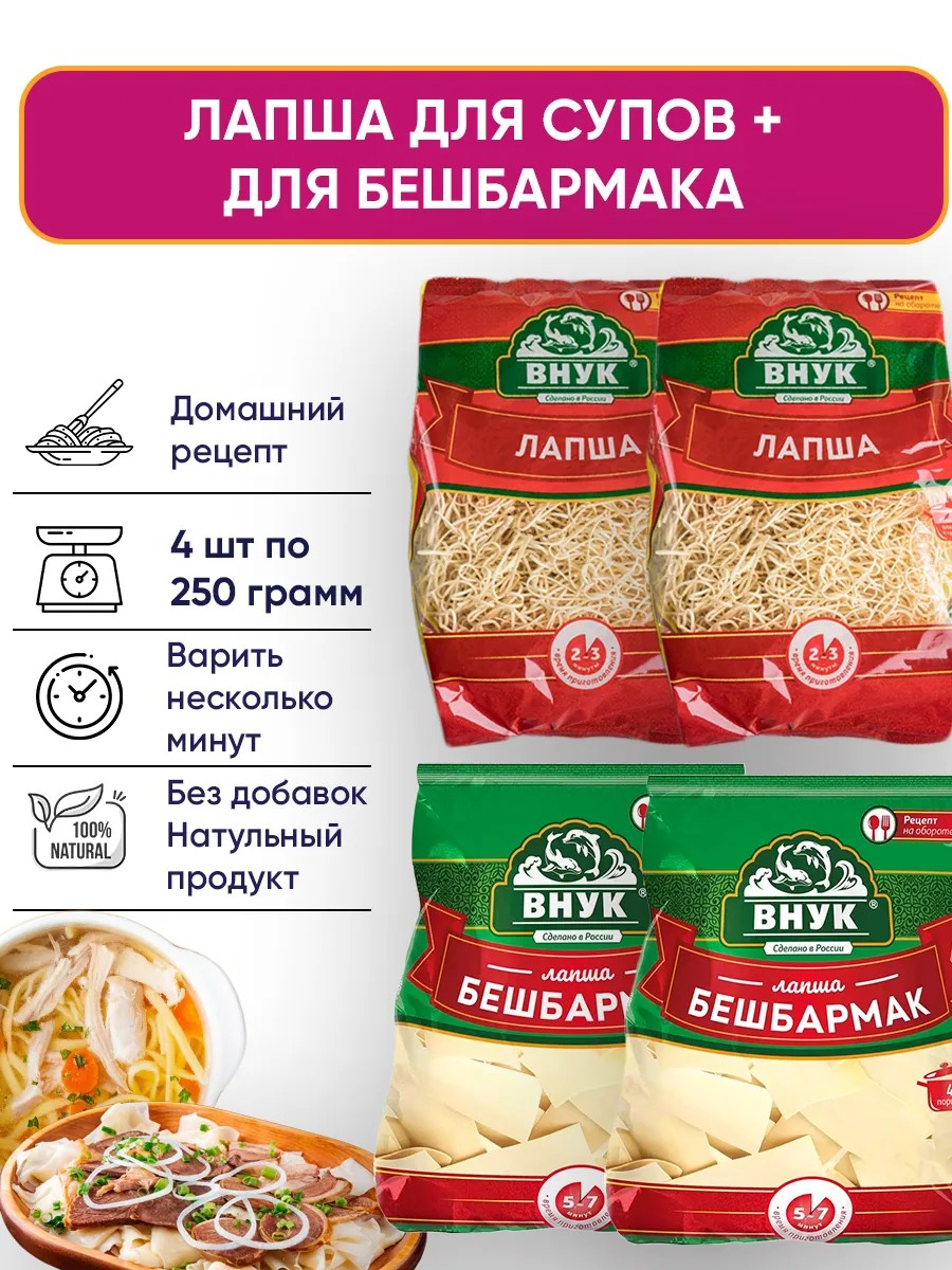 Каждая порция лапши Внук сделана из высококачественной муки, что обеспечивает ей отличную текстуру и вкус. Она идеально подходит для приготовления знаменитого бешбармака — блюда, которое сочетает в себе нежное мясо, ароматные специи и насыщенный бульон. Лапша легко варится и прекрасно удерживает соус, что делает ее идеальной основой для любого мясного блюда.