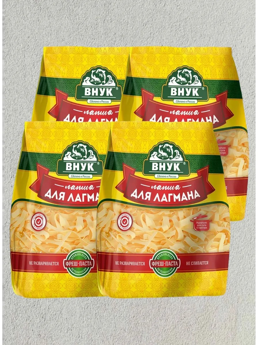 Лапша для лагмана «ВНУК» имеет отличные вкусовые качества и подходит как для традиционного приготовления лагмана, так и для гарниров и супов, праздничных, диетических и постных блюд. В готовом виде лапша для лагмана обладает нежной консистенцией, при этом имеет упругую структуру, яркий пшеничный вкус и аромат. В составе всего два ингредиента — мука и вода.