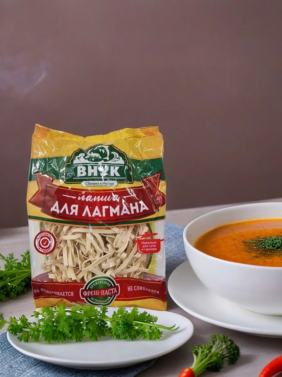 Лапша для лагмана «ВНУК» имеет отличные вкусовые качества и подходит как для традиционного приготовления лагмана, так и для гарниров и супов, праздничных, диетических и постных блюд.
