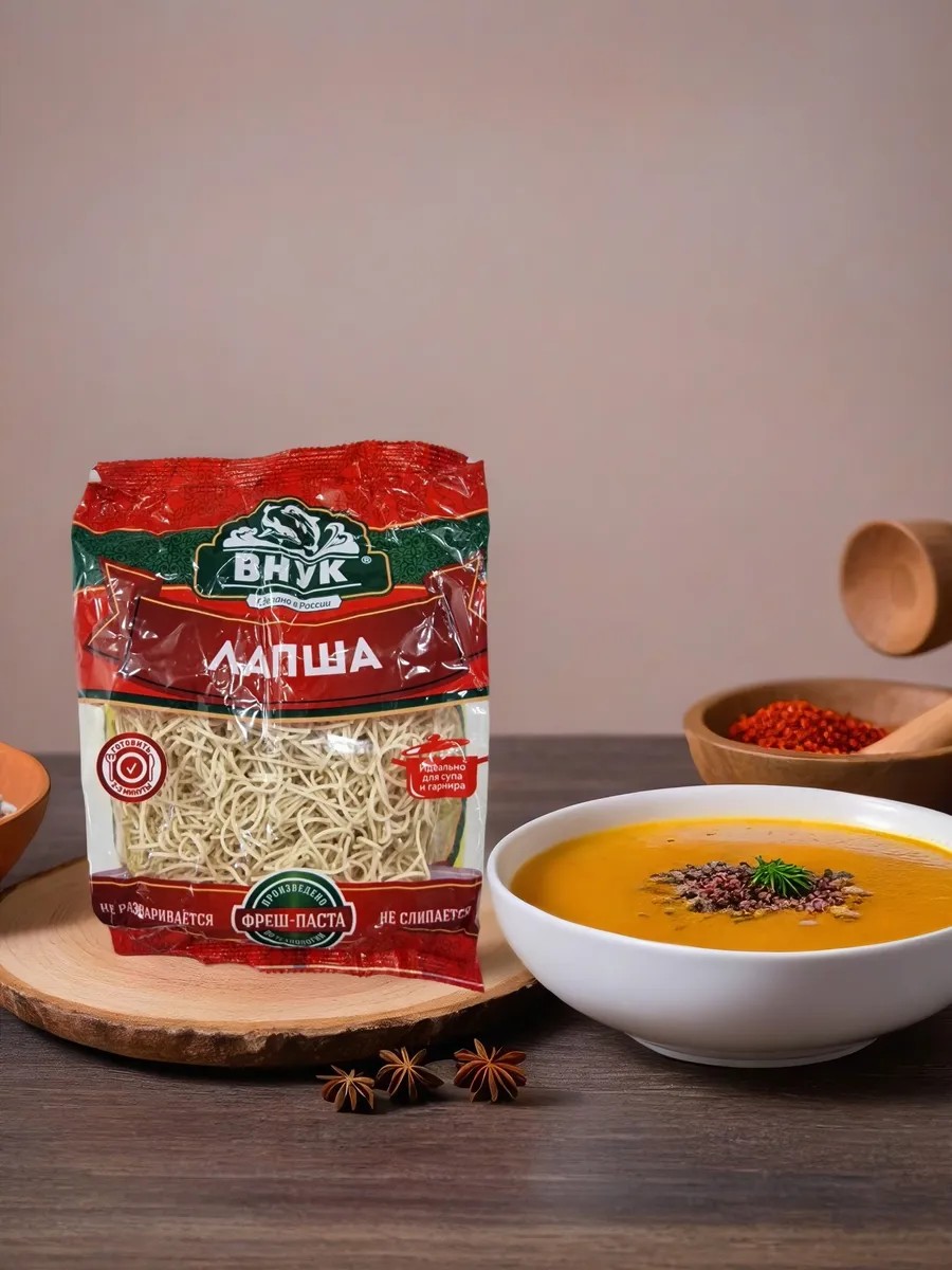 Лапша «ВНУК» — тонко раскатанное тесто, порезанное полосками и высушенное по уникальной технологии.