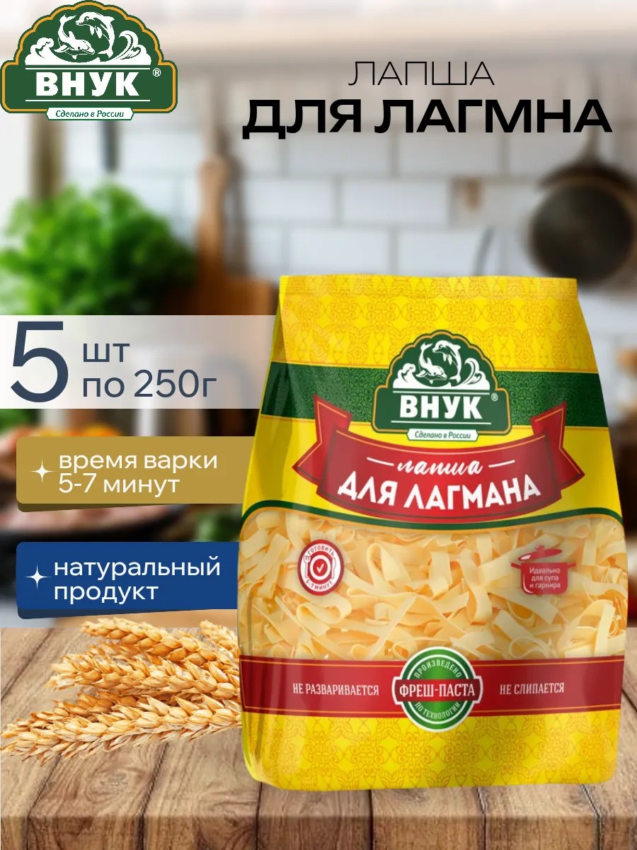 Лапша "Внук" - это идеальный выбор для приготовления вкусного и ароматного лагмана. Эта пшеничная лапша изготовлена по традиционным рецептам, что придает ей неповторимый домашний вкус. Лапша "Внук" не содержит ароматизаторов, усилителей вкуса и ГМО, поэтому вы можете быть уверены в ее натуральности и качестве.Лапша для лагмана «ВНУК» имеет отличные вкусовые качества и подходит как для традиционного приготовления лагмана, так и для гарниров и супов, праздничных, диетических и постных блюд.