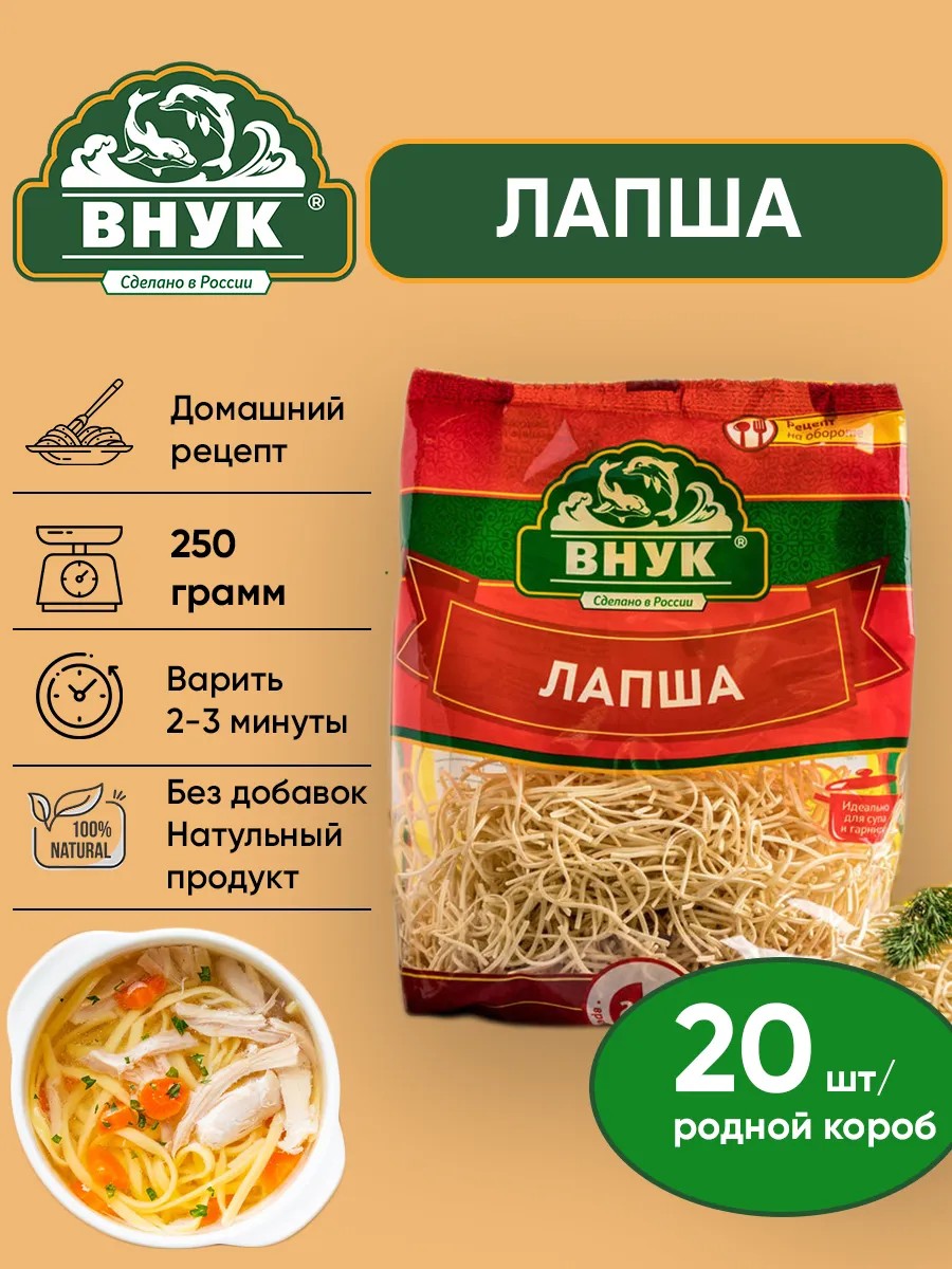 Лапша "Внук" — это идеальный выбор для тех, кто ценит качество и вкус домашней кухни. Наша лапша изготавливается по традиционным рецептам с использованием только натуральных ингредиентов. Она обладает тонкой текстурой и легким вкусом, что делает её универсальным гарниром или основным блюдом.