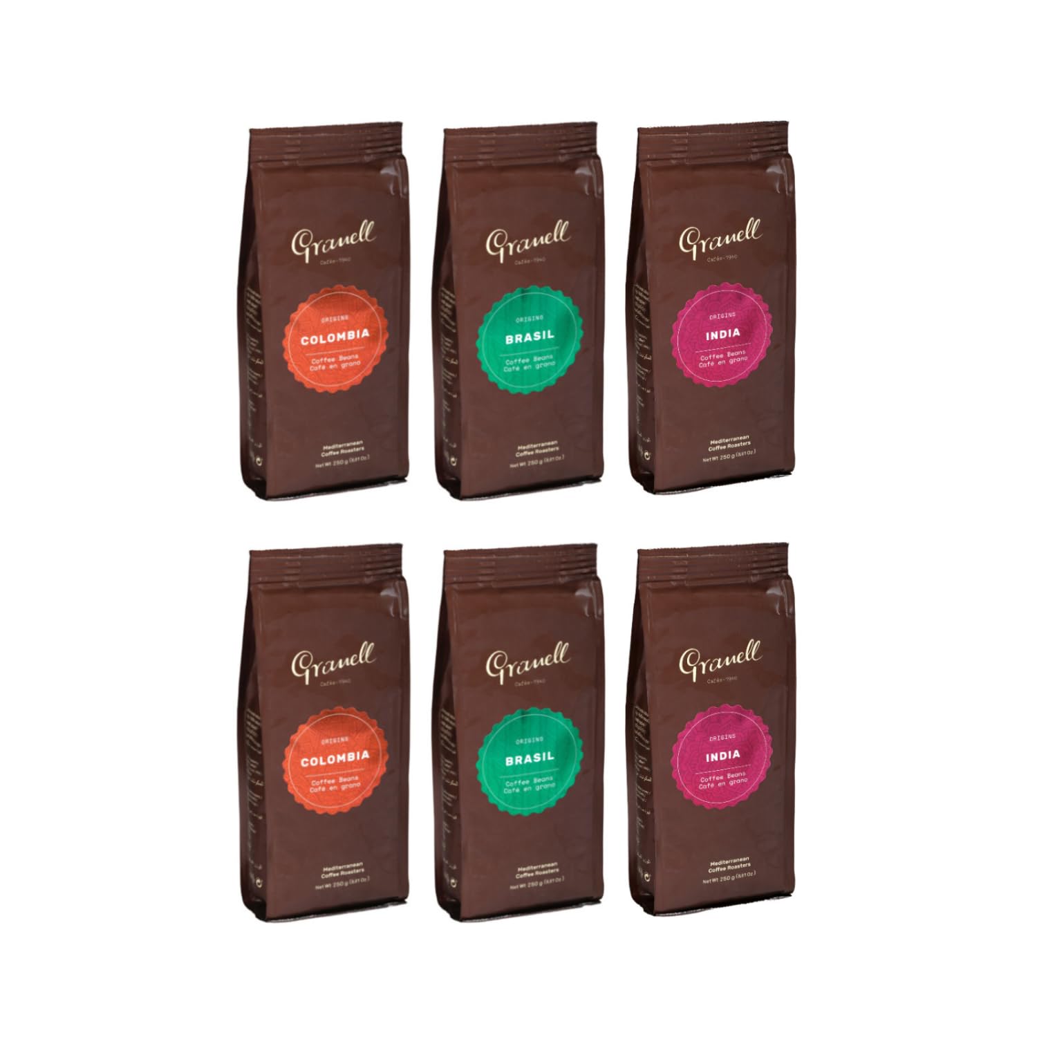 Granell Pure Origin - Origins Tasting Pack - Coffee Gift Box | 100% Arabica Coffee Beans - 2xBrazilian Coffee 2xColombian Coffee 2xIndian Coffee - Pack 6x250g - Coffee Bean Box