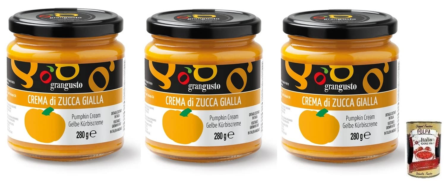 Grangusto Crema di Zucca Gialla Lot de 3 pots de crème de citrouille jaune et légumes d'Italie Idéal pour la préparation de risottos et de pâtes, pot de 280 g boîte italienne Gourmet Polpa di Pomodoro 400 g