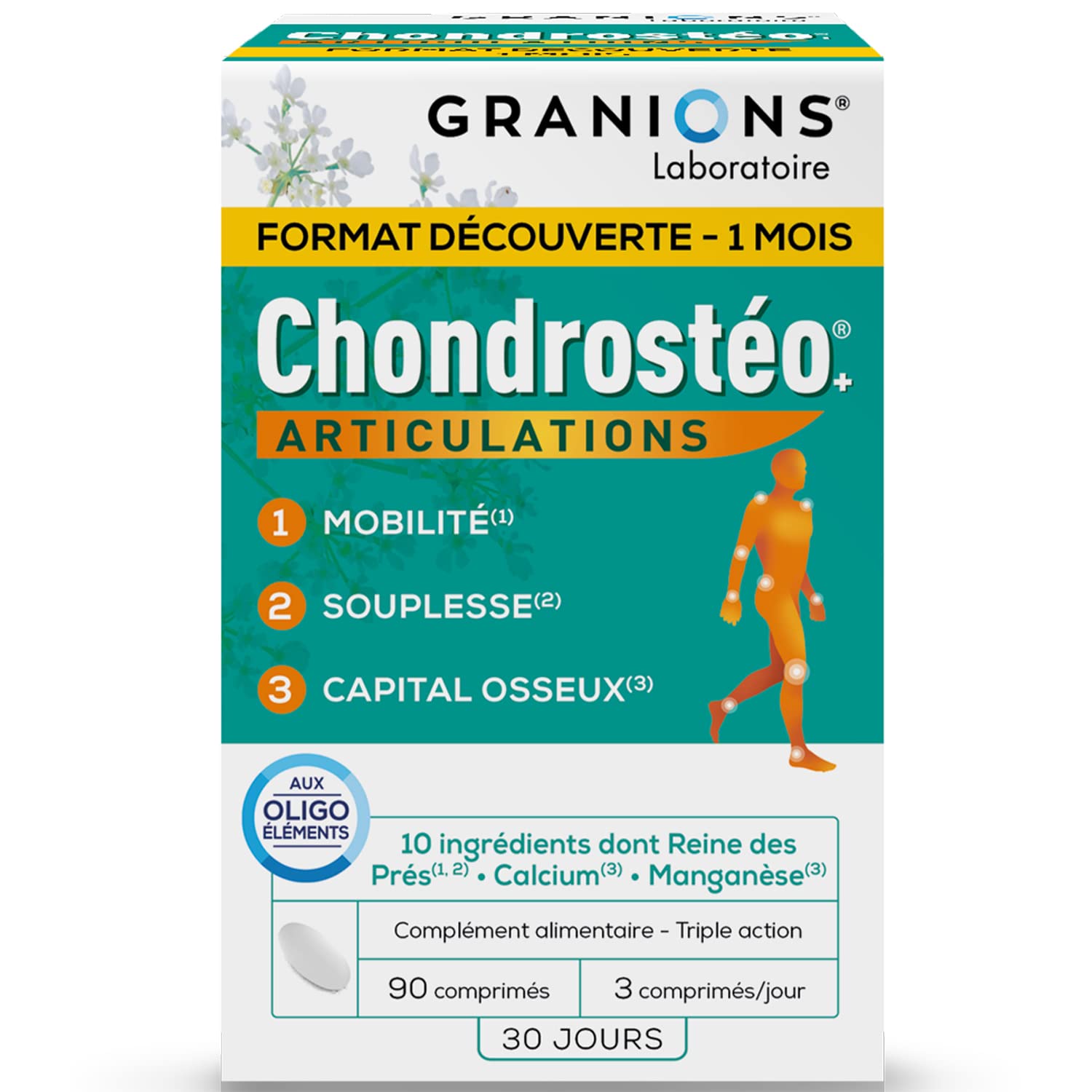 and Directions for Use: Take 3 tablets at once with a large glass of water, preferably in the morning with breakfast. Use for a 3-month course and repeat if necessary. store away from heat and humidity. Safety Warning: This food supplement is not recommended for people with diabetes or pre-diabetes, asthma, or those being treated with vitamin K antagonists for people with a food allergy to shellfish or insects or for people whose diet is controlled for sodium, potassium, or calcium, as these supplements can be a significant source of these minerals. This product is not recommended for pregnant or breastfeeding women or children under 18 years of age. For adult use only. Ingredients: Glucosamine HCl, minerals: calcium carbonate (corn starch) - tricalcium phosphate - copper gluconate - manganese gluconate, methylsulfonylmethane (MSM), sodium chondroitin sulfate, devil's claw extract (Harpagophytum procumbens, maltodextrin), meadowsweet, blackcurrant, bamboo extract, anti-caking agent: magnesium stearate, emulsifiers: mono-, di-, and triglycerides of fatty acids. Coating ingredients: hydroxypropyl methylcellulose, microcrystalline cellulose, stearic acid. P.when('A').execute(function(A) { A.on('a:expander:toggle_description:toggle:collapse', function(data) { window.scroll(0, data.expander. expander[0].offsetTop-100) }) }) Directions for use: Take 3 tablets at once with a large glass of water, preferably in the morning with breakfast. Use for a 3-month course and repeat if necessary. store away from heat and humidity. Safety Warning: This food supplement is not recommended for people with diabetes or pre-diabetes, asthma, or those being treated with vitamin K antagonists for people with a food allergy to shellfish or insects or for people whose diet is controlled for sodium, potassium, or calcium, as these supplements can be a significant source of these minerals. This product is not recommended for pregnant or breastfeeding women or children under 18 years of age. For adults only. See moreMade in France. Laboratoire des Granions has been an expert in natural health and oligotherapy since 1948. Recommended by over 6,000 doctors, Laboratoire des Granions products are available in more than 15,000 pharmacies in France. TRIPLE ACTION FORMULA: mobility, flexibility, and bone health to promote your daily joint well-being. MINERALS AND TRACE ELEMENTS: Calcium and Manganese contribute to maintaining bone health Bamboo extract standardized in silicon Copper contributes to maintaining connective tissue. PLANTS WITH RECOGNIZED BENEFITS: Harpagophytum, traditionally used to promote joint comfort Blackcurrant leaves and Meadowsweet help improve joint mobility. NATURALLY OCCURRING CONSTITUENTS IN CARTILAGE: Glucosamine HCl at a dose of 1125 mg, Chondroitin sulfate sodium at a dose of 150 mg, Methylsulfonylmethane (MSM) containing sulfur. A food supplement specifically formulated for joints, CHONDROSTEO Plus JOINTS is a triple-action formula designed for recurring episodes of mild to moderate discomfort.Description du produit Consignes d'utilisation: Prendre 3 comprimés en 1 prise avec un grand verre d'eau de préférence le matin au cours du petit déjeuner. À utiliser en programme de 3 mois et à renouveler si nécessaire. À conserver à l'abri de la chaleur et de l'humidité. » « Avertissement de sécurité : La consommation de ce complément alimentaire est déconseillée aux personnes diabétiques ou pré-diabétiques, asthmatiques, traitées par anti-vitamine K aux personnes présentant une allergie alimentaire aux crustacés ou aux insectes aux personnes dont l'alimentation est contrôlée pour le sodium, le potassium ou le calcium car ces compléments peuvent en être une source importante. Ce produit est déconseillé chez la femme enceinte ou allaitante et aux enfants de moins de 18 ans. Réservé à l'adulte. Ingrédients INGRÉDIENTS: Glucosamine HCL, minéraux : carbonate de calcium (amidon de maïs) - phosphate tricalcique - gluconate de cuivre - gluconate de manganèse, méthylsulfonylméthane (MSM), chondroïtine sulfate sodique, extrait d'harpagophytum (Harpagophytum procumbens, maltodextrine), reine des près, cassis, extrait de bambou, anti-agglomérant : stéarate de magnésium, émulsifiants : mono, di et tri-glycérides d'acides gras. INGRÉDIENTS D'ENROBAGE : hydroxyproplmethylcellulose, cellulose microcristalline, acide stéarique. P.when('A').execute(function(A) { A.on('a:expander:toggle_description:toggle:collapse', function(data) { window.scroll(0, data.expander. expander[0].offsetTop-100) }) }) Mode d'emploi Prendre 3 comprimés en 1 prise avec un grand verre d'eau de préférence le matin au cours du petit déjeuner. À utiliser en programme de 3 mois et à renouveler si nécessaire. À conserver à l'abri de la chaleur et de l'humidité. Avertissement De Sûreté La consommation de ce complément alimentaire est déconseillée aux personnes diabétiques ou pré-diabétiques, asthmatiques, traitées par anti-vitamine K aux personnes présentant une allergie alimentaire aux crustacés ou aux insectes aux personnes dont l'alimentation est contrôlée pour le sodium, le potassium ou le calcium car ces compléments peuvent en être une source importante. Ce produit est déconseillé chez la femme enceinte ou allaitante et aux enfants de moins de 18 ans. Réservé à l'adulte. Voir plusFabriqué en France. Le laboratoire des Granions est expert en santé naturelle et Oligothérapie depuis 1948. Conseillé par plus de 6000 médecins, les produits du laboratoire des Granions sont présents dans plus de 15000 pharmacies en France. FORMULE TRIPLE ACTION : mobilité, souplesse et capital osseux pour favoriser votre bien-être articulaire au quotidien. DES MINÉRAUX ET DES OLIGOÉLÉMENTS : le Calcium et le Manganèse contribuant au maintien du capital osseux, l'extrait de Bambou titré en silicium, le Cuivre contribuant au maintien des tissus conjonctifs. DES PLANTES DONT LES VERTU