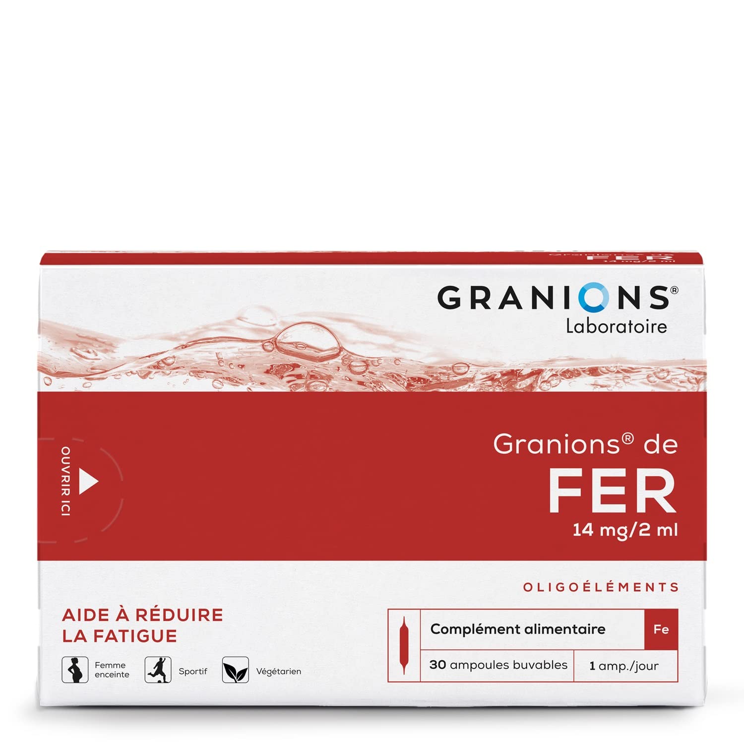 : Discover our iron supplements in ampoules, specially designed to combat fatigue and the effects of iron deficiency. Our iron treatment offers a practical and effective solution for managing anemia while improving your energy and vitality. Thanks to this iron-rich supplement, you will promote better oxygenation of your cells, strengthen your immune system, and regain balanced overall health. Choose performance and well-being with our unique iron supplement formula. Ingredients: Purified water, colloidal agent: amylose, mineral: iron lactate, thickener: glycerin, antioxidant: ascorbic acid, sweetener: sucralose, cherry flavor. Per ampoule: Iron 14 mg (100 NRV ). Nutritional Values. Directions for use: For oral use, take 1 ampoule per day, diluted in a glass of water, preferably between meals. A 30-day program is recommended. No significant side effects. PRECAUTIONS FOR USE: This medical device should be used as part of a healthy lifestyle and not as a substitute for a varied and balanced diet. Legal Notices P.when('A').execute(function(A) { A.on('a:expander:toggle_description:toggle:collapse', function(data) { window.scroll(0, data.expander. expander[0].offsetTop-100) }) }) Instructions for use: Easy to take: 1 ampoule per day, preferably between meals. Suitable for vegetarians. Safety Warning: Do not use if you have a history of allergy to any of the ingredients in the solution. Do not exceed the recommended daily dose. Granions de Fer should be used as a food supplement as part of a varied and balanced diet and a healthy lifestyle. See moreLABORATOIRE DES GRANIONS A French brand specializing in trace element therapy and natural health since 1948, sold in pharmacies and drugstores. Complete range of food supplements. Our Granions iron is made in France. FOOD SUPPLEMENT Boost your iron levels to combat fatigue related to iron deficiency and control anemia, thanks to a practical and effective iron treatment. PROFILES AT RISK OF DEFICIENCY Pregnant women, athletes, children, and vegans are particularly affected because their iron requirements are increased. FATIGUE Improve your energy and reduce fatigue by combating iron deficiency, thus promoting better cell oxygenation and a strengthened immune system. IRON TREATMENT (14mg) Regain vitality and endurance by meeting your body's iron needs, thanks to our ampoule-based food supplement specially formulated to support your overall health and control anemia.Description du produit Découvrez nos compléments alimentaires de fer en ampoules, spécialement conçus pour combattre la fatigue et les effets de la carence en fer. Notre cure de fer vous offre une solution pratique et efficace pour contrôler l'anemie tout en améliorant votre énergie et votre vitalité. Grâce à ce complement alimentaire riche en fer, vous favoriserez une meilleure oxygénation de vos cellules, renforcerez votre système immunitaire et retrouverez une santé globale équilibrée. Faites le choix de la performance et du bien-être avec notre formule unique de complément alimentaire de fer. Ingrédients Eau purifiée, agent colloïdal : amylose, minéral : lactate de fer, épaississant : glycérine, anti-oxydant : acide ascorbique, édulcorant : sucralose, arôme cerise. Pour 1 ampoule : Fer 14 mg Fer 100 VNR ). Valeurs Nutritionnelles Conseil d'utilisation : Par voie orale, prendre, 1 ampoule par jour, à diluer dans un verre d'eau, de préférence en dehors des repas. Programme de 30 jours conseillé. Sans effets secondaires notables PRÉCAUTIONS D'EMPLOI : Ce dispositif médical doit être utilisé dans le cadre d'un mode de vie sain et ne pas être donné comme un substitut d'un régime alimentaire varié et équilibré. Mentions Légales P.when('A').execute(function(A) { A.on('a:expander:toggle_description:toggle:collapse', function(data) { window.scroll(0, data.expander. expander[0].offsetTop-100) }) }) Mode d'emploi Facile à prendre : 1 ampoule par jour, de préférence en dehors des repas. Convient aux végétariens Avertissement De Sûreté Ne doit pas être utilisé en cas d'antécédents d'allergie à l'un des constituants de la solution. Ne pas dépasser la dose journalière recommandée. Granions de Fer est à utiliser en tant que complément alimentaire dans le cadre d'une alimentation variée et équilibrée et d'un mode de vie sain. Voir plusLABORATOIRE DES GRANIONS Marque française experte en oligothérapie et santé naturelle depuis 1948, vendue en pharmacies et parapharmacies. Gamme complète de compléments alimentaires. Notre fer Granions est fabriqué en France. COMPLÉMENT ALIMENTAIRE Renforcez vos niveaux de fer pour combattre la fatigue liée à la carence en fer et contrôler l'anemie, grâce à une cure de fer pratique et efficace. PROFILS RISQUE DE CARENCE Les femmes enceintes, sportifs, enfants et végétaliens sont particulièrement concernés car leurs besoins en fer sont augmentés. FATIGUE Améliorez votre énergie et réduisez la fatigue en combattant la carence en fer, favorisant ainsi une meilleure oxygénation des cellules et un système immunitaire renforcé. CURE DE FER (14mg) Retrouvez vitalité et endurance en comblant les besoins en fer de votre corps, grâce à notre complement alimentaire en ampoule spécialement formulé pour soutenir votre santé globale et contrôler l'anemie.GRANIONS DE FER - 30 ampoules 30 unité (Lot de 1) FER ampoules