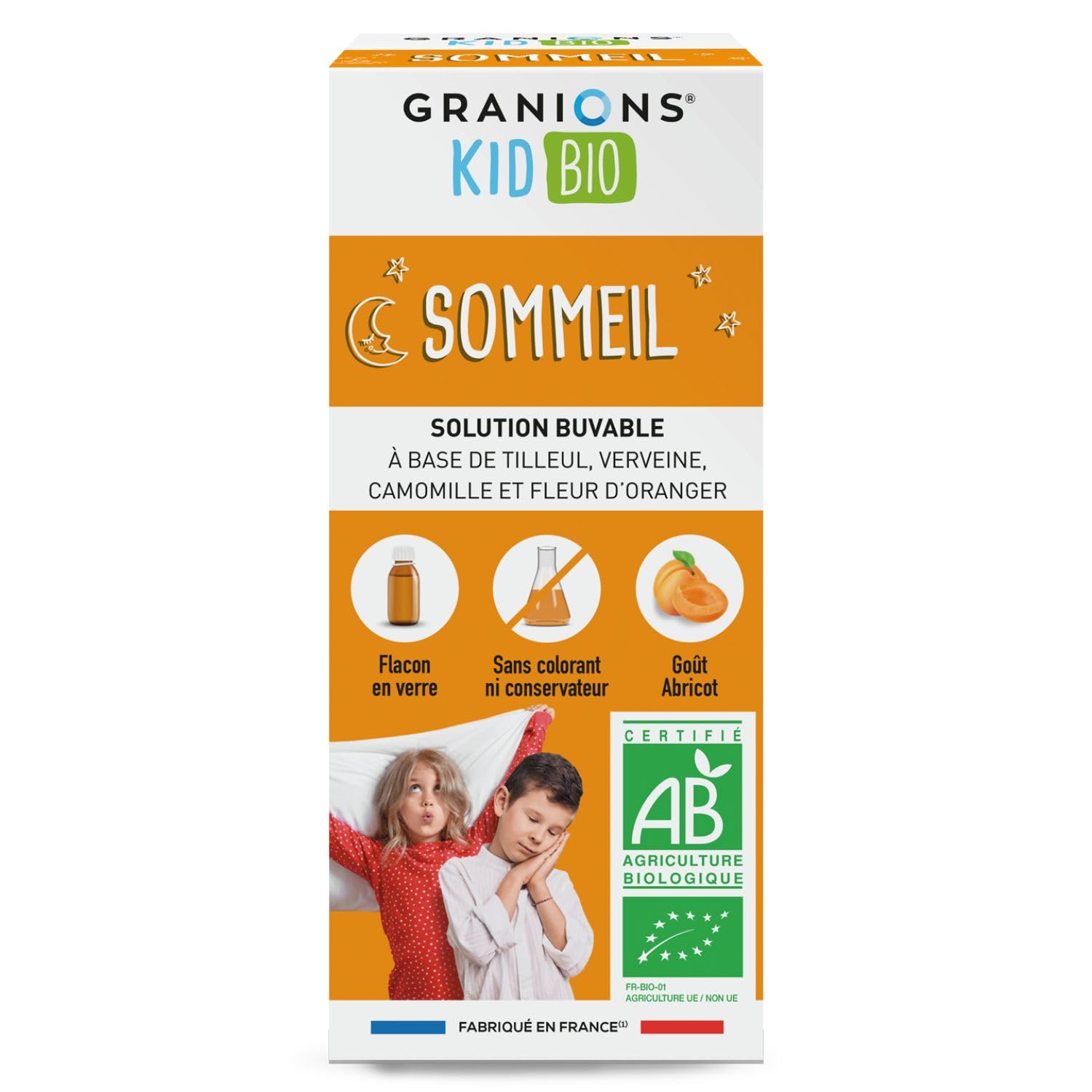 : Promotes relaxation and natural, restorative sleep. Do not exceed the recommended daily dose. Keep out of reach of young children. This product is not a substitute for a varied and balanced diet and a healthy lifestyle. Best before the date indicated on the bottom of the box. Keep out of reach of young children. It is recommended to consume this supplement as part of a varied and balanced diet and a healthy lifestyle. Do not exceed the recommended dose. Use during pregnancy is not recommended (contains verbena). Distributed by: EA PHARMA ZAC du Font de l'Orme 1198 avenue Maurice Donat 06250 MOUGINS – France DIRECTIONS FOR USE: Before age 5: 2 teaspoons after dinner. - After age 5: 3 teaspoons after dinner. Use for 8 days or occasionally, repeating if necessary. This product is also suitable for adults over 15 years of age. COMPOSITION 3 teaspoons (15 ml): Agave syrup . 4.07 g (Agave tequilana) Orange blossom water . 325.5 mg Linden extract . 276.7 mg (Tilia platyphyllos) Chamomile extract . 162.75 mg (Matricaria chamomilla) Verbena extract . 162.75 mg (Verbena officinalis) California poppy extract . 162.75 mg (Eschscholzia californica) Passionflower extract . 81.4 mg (Passiflora incarnata) Ingredients from organic farming Ingredients: Water, agave syrup (Agave tequilana) , hydroglycerin plant extracts : linden (Tilia platyphyllos) , chamomile (Matricaria chamomilla) - verbena (Verbena officinalis) - California poppy (Eschscholzia californica) - passionflower (Passiflora incarnata) , orange blossom water , natural apricot flavor, acidity regulators: citric acid - ascorbic acid, thickener: xanthan gum, natural rosemary flavor. Instructions for use: Before age 5: 2 teaspoons after dinner. - After age 5: 3 teaspoons after dinner. Take as an 8-day course or as needed, repeating if necessary. This product is also suitable for adults over 15 years of age. Safety Warning: This food supplement should be used as part of a healthy lifestyle and not as a substitute for a varied and balanced diet. Do not exceed the recommended daily dose. Keep out of reach of young children. In general, pregnant and breastfeeding women are advised to consult a healthcare professional before taking any supplements. See moreLEADING FRENCH PHARMACY BRAND: Laboratoire des GRANIONS, experts in trace element therapy since 1948. Complete range of high-quality French food supplements, developed by our experts. EXCLUSIVE LABELS: Organic, no added sugar (contains naturally occurring sugars), no artificial colors or preservatives, no artificial flavors, vegan, gluten-free, made in France. EASY TO TAKE: From 3 to 5 years: 2 teaspoons after dinner. After 5 years: 3 teaspoons after dinner. For an 8-day course or as needed. Repeat if necessary. CHILDREN LOVE: The delicious natural apricot flavor of Granions Kid Organic Sleep Syrup is very popular with children and makes it easy to take. CERTIFIED ORGANIC ACTIVE INGREDIENTS: This food supplement is produced according to organic farming methods. It is made with certified organic premium quality agave syrup. PROMOTES CHILDREN'S SLEEP: Linden reduces stress, and verbena promotes sleep. Chamomile and passionflower calm nervousness. Eschscholzia promotes relationships.Description du produit Favorise la relaxation et un sommeil naturel et réparateur. Ne pas dépasser la dose journalière recommandée Tenir hors de portée des jeunes enfants Ne se substitue pas à un régime alimentaire varié et équilibré ainsi qu'a un mode de vie sain A consommer de préférence avant la date indiquée sous l'étui. Tenir hors de portée des jeunes enfants. Il est conseillé de consommer ce complément dans le cadre d'une alimentation variée et équilibrée et d'un mode de vie sain. Ne pas dépasser la dose recommandée. L'emploi chez les femmes enceintes est déconseillé (verveine). Distribué par : EA PHARMA ZAC du Font de l'Orme 1198 avenue Maurice Donat 06250 MOUGINS – France CONSEILS D'UTILISATION : Avant 5 ans : 2 cuillères à café après le dîner. - Après 5 ans : 3 cuillères à café après le dîner. En programme de 8 jours ou ponctuellement, à renouveler si nécessaire. Ce produit peut également convenir à l'adulte de plus de 15 ans. COMPOSITION 3 cuillères à café (15 ml) : Sirop d'agave . 4,07 g (Agave tequilana) Eau de fleur d'oranger . 325,5 mg Extrait de tilleul . 276,7 mg (Tilia platyphyllos) Extrait de camomille . 162,75 mg (Matricaria chamomilla) Extrait de verveine . 162,75 mg (Verbena officinalis) Extrait d'eschscholtzia . 162,75 mg (Eschscholzia californica) Extrait de passiflore . 81,4 mg (Passiflora incarnata) Ingrédients issus de l'agriculture biologique Ingrédients INGRÉDIENTS : Eau, sirop d'agave (Agave tequilana) , extraits hydroglycérinés de plantes : tilleul (Tilia platyphyllos) , camomille (Matricaria chamomilla) - verveine (Verbena officinalis) - eschscholtzia (Eschscholzia californica) - passiflore (Passiflora incarnata) , eau de fleur d'oranger , arôme naturel d'abricot, correcteurs d'acidité : acide citrique - acide ascorbique, épaississant : gomme de xanthane, arôme naturel de romarin P.when('A').execute(function(A) { A.on('a:expander:toggle_description:toggle:collapse', function(data) { window.scroll(0, data.expander. expander[0].offsetTop-100) }) }) Mode d'emploi Avant 5 ans : 2 cuillères à café après le dîner. - Après 5 ans : 3 cuillères à café après le dîner. En programme de 8 jours ou ponctuellement, à renouveler si nécessaire. Ce produit peut également convenir à l'adulte de plus de 15 ans. Avertissement De Sûreté Ce complément alimentaire doit être utilisé dans le cadre d'un mode de vie sain et ne pas être utilisé comme substitut d'un régime alimentaire varié et équilibré. Ne pas dépasser la dose journalière recommandée. Tenir hors de la portée des jeunes enfants. De manière générale, il est recommandé d'inviter les femmes enceintes et allaitantes à prendre l'attache d'un professionnel de santé avan