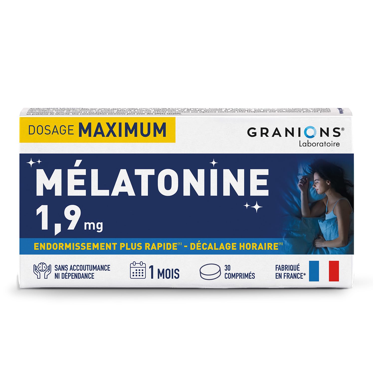 : Granions Melatonin 1.9 mg is a sleep supplement with an ultra-high dose of melatonin, designed to promote rapid sleep onset and alleviate the effects of jet lag. Ideal during periods of stress, travel, night shifts, or any other sleep disorder, it offers a natural alternative to sleep gummies. Its effectiveness is recognized even at 1 mg of melatonin: our optimal dosage of 1.9 mg maximizes the effects without causing dependence, habituation, or drowsiness upon waking. Sugar-free, gluten-free, and additive-free, this supplement is also vegan and made in France. Ingredients: Bulking agent: microcrystalline cellulose, anti-caking agent: magnesium salts of fatty acids, melatonin. P.when('A').execute(function(A) { A.on('a:expander:toggle_description:toggle:collapse', function(data) { window.scroll(0, data.expander. expander[0].offsetTop-100) }) }) Directions for use: Take 1 tablet daily with a large glass of water, in the evening, 30 minutes before bedtime. Repeat as needed. Store in a cool, dry place away from heat and humidity. Safety Warning: This food supplement should be used as part of a healthy lifestyle and not as a substitute for a varied and balanced diet. Do not exceed the recommended daily dose. Limit use to occasional use. Keep out of reach of young children. For people with epilepsy, asthma, mood, behavioral, or personality disorders, or those taking medication, consult your doctor before using this product. For adults only. Not recommended for pregnant or breastfeeding women, people with inflammatory or autoimmune diseases, or those performing activities requiring sustained alertness where drowsiness could pose a safety risk. Excessive consumption may have a laxative effect. See moreLABORATOIRE DES GRANIONS A French brand specializing in trace element therapy and natural health since 1948, sold in pharmacies and parapharmacies. A complete range of food supplements and the number 1 collagen brand in France. QUICK AND EASY TO USE Take one 1.9 mg melatonin tablet in the evening, approximately 30 minutes before bedtime. This sleep supplement acts quickly to promote natural sleep onset, alleviate jet lag, or combat stress. Suitable for occasional use or as a course of treatment. CLEAN FORMULA – SUGAR-FREE, GLUTEN-FREE, AND ADDITIVE-FREE Designed to suit a wide range of people, this sleep supplement is sugar-free, gluten-free, preservative-free, and colorant-free. Vegan and made in France, it adapts to the needs related to stress, night work, travel, or occasional sleep disturbances – a natural and effective anti-stress solution. NON-ADDICTION OR HABITATION This melatonin-based food supplement is non-habit forming, non-addictive, and does not cause drowsiness upon waking. You'll enjoy quality sleep. An alternative to sleep gummies. MELATONIN 1.9 MG – MAXIMUM DOSAGE This sleep supplement contains 1.9 mg of melatonin, the maximum dosage. To promote faster sleep onset and reduce the effects of jet lag. Ideal for people with temporary or lifestyle-related sleep disturbances.Description du produit Granions Mélatonine 1,9 mg est un complément alimentaire sommeil à la formule ultra-dosée en melatonine, conçu pour favoriser un endormissement rapide et atténuer les effets du décalage horaire. Bon en période de stress, lors de voyages, de travail de nuit ou de tout autre trouble du sommeil, il constitue une alternative naturelle aux gummies sommeil. Son efficacité est reconnue dès 1 mg de melatonine : notre dosage optimal de 1,9 mg maximise les effets sans provoquer de dépendance, d'accoutumance ni de somnolence au réveil. Sans sucre, sans gluten et sans additifs, ce complément est aussi vegan et fabriqué en France. Ingrédients Agent de charge : cellulose microcristalline, anti-agglomérant : sels de magnésium d'acides gras, mélatonine. P.when('A').execute(function(A) { A.on('a:expander:toggle_description:toggle:collapse', function(data) { window.scroll(0, data.expander. expander[0].offsetTop-100) }) }) Mode d'emploi Prendre 1 comprimé par jour avec un grand verre d'eau, le soir, 30 minutes avant le coucher. A renouveler quand c'est nécessaire.À conserver dans un endroit frais, sec et à l'abri de la chaleur et de l'humidité Avertissement De Sûreté Ce complément alimentaire doit être utilisé dans le cadre d'un mode de vie sain et ne pas être utilisé comme substitut d'un régime alimentaire varié et équilibré. Ne pas dépasser la dose journalière recommandée. Limiter la prise à un usage ponctuel. Tenir hors de la portée des jeunes enfants. Pour les personnes épileptiques, asthmatiques, souffrant de troubles de l'humeur, du comportement ou de la personnalité, ou suivant un traitement médicamenteux, consultez votre médecin avant de consommer ce produit. Réservé à l'adulte. Déconseillé aux femmes enceintes et allaitantes, aux personnes souffrant de maladies inflammatoires, auto-immunes et aux personnes devant réaliser une activité nécessitant une vigilance soutenue chez lesquelles une somnolence pourrait poser un problème de sécurité. Une consommation excessive peut avoir des effets laxatifs Voir plusLABORATOIRE DES GRANIONS Marque française experte en oligothérapie et santé naturelle depuis 1948, vendue en pharmacies et parapharmacies. Gamme complète de compléments alimentaires et numéro 1 du collagène en France. UTILISATION SIMPLE ET RAPIDE Prendre 1 comprimé de melatonine 1,9 mg le soir, environ 30 minutes avant le coucher. Ce complément alimentaire sommeil agit rapidement pour favoriser un endormissement naturel ou du décalage horaire ou en période de stress. Convient en usage ponctuel ou en cure. FORMULE CLEAN – SANS SUCRE, SANS GLUTEN NI ADDITIFS Conçu pour convenir au plus grand nombre, ce complément alimentaire sommeil est sans sucre, sans gluten, sans conservateur et sans colorant. Vegan et fabriqué en France, il s'adapte aux besoins liés au stress, au travail de nuit, aux voyages ou aux troubles du sommeil ponctue