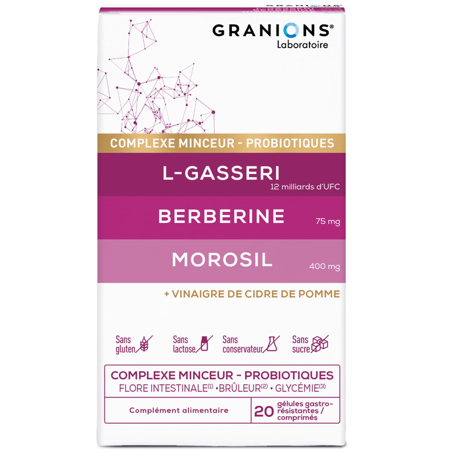 : Discover Granions Probiotic Gut Flora Slimming Complex, an innovative food supplement formulated to promote slimming and extra-strength weight loss while effectively balancing your gut microbiota. Thanks to a gastro-resistant capsule containing 12 billion CFU of Lactobacillus Gasseri, a recognized probiotic gut flora, and a tablet concentrated with morosil, berberine, apple cider vinegar, and chromium, this powerful fat burner works deep down. Our probiotic gut flora slimming complex supports digestion, improves nutrient absorption, reduces cravings, and limits fat storage to help you lose belly fat. The combination of morosil and apple cider vinegar, along with berberine and chromium, naturally boosts weight loss and regulates blood sugar. This probiotic food supplement promotes a flat stomach and acts as a powerful fat burner for fast and effective weight loss. Our slimming complex, containing morosil and apple cider vinegar for weight loss, is also formulated without gluten, sugar, lactose, or preservatives. The probiotic gut flora contained in each dose helps improve your gut flora while acting as an effective fat burner. Thanks to the combined action of morosil, apple cider vinegar, Lactobacillus gasseri probiotic, and chromium, the Granions Slimming Complex supports your goal of fast and effective weight loss and improves your overall well-being. The probiotic slimming complex is ideal for losing weight quickly and effectively. The Granions Slimming Complex is ideal for those looking for a natural and effective solution for gut microbiota, digestion, and blood sugar regulation with a visible flat stomach effect. Capsule Ingredients: bulking agent: maltodextrin, hydroxypropylmethylcellulose capsule, Lactobacillus gasseri probiotic, anti-caking agent: magnesium salts of fatty acids. Tablet: Citrus extract (Citrus sinensis), anti-caking agent: microcrystalline cellulose, thickener: gum arabic, Berberis extract (Berberis aristata), apple cider vinegar, Kola nut extract (Cola nitida), caffeine, anti-caking agents: tricalcium phosphate, magnesium salts of fatty acids, chromium picolinate. Directions for use: Take 1 tablet in the morning or at midday and 1 probiotic capsule in the evening, ideally before a meal. If the tablet is too large, it can be cut in half before swallowing. Store in a cool, dry place away from heat and humidity. Safety Warning: This food supplement should be used as part of a healthy lifestyle and not as a substitute for a varied and balanced diet. Do not exceed the recommended daily dose. Keep out of reach of young children. Not recommended for pregnant or breastfeeding women, diabetics, or those with liver or heart problems due to potential adverse effects. This recommendation also applies to children and adolescents (berberine). See moreLABORATOIRE DES GRANIONS A French brand specializing in oligotherapy and natural health since 1948, sold in pharmacies and parapharmacies. Complete range of food supplements. SIMPLE TO USE, MADE IN FRANCE Take 1 tablet in the morning or at midday and 1 probiotic capsule in the evening, ideally before meals, for fast and effective weight loss. MOROSIL WEIGHT LOSS BERBERINE Our formula combines a gastro-resistant capsule and a tablet rich in morosil, berberine, apple cider vinegar for weight loss, and chromium for optimal absorption and complete weight loss support. The intestinal flora probiotic Lactobacillus Gasseri (L. Gasseri) helps with slimming while promoting a flat stomach. This intestinal flora probiotic food supplement acts as a powerful fat burner for weight loss. MOROSIL WEIGHT LOSS Active ingredients like Morosil, Berberine, Apple Cider Vinegar, Chromium, and Cola Nut act as a powerful fat burner for slimming and weight loss. Chromium promotes normal blood sugar levels and aids in effective fat burning for a flat stomach. Morosil has been the subject of two scientific studies demonstrating its benefits for body shape, flat stomach, and weight loss. PROBIOTIC GUT FLORA Granions' Probiotic Slimming Complex is formulated with 12 billion CFU of Lactobacillus gasseri (L. gasseri) probiotic. This probiotic slimming complex enriches the gut microbiota to ensure effective weight loss, nutrient assimilation, and limit fat storage. This probiotic has a satiating effect, promoting weight loss and a flat stomach.Description du produit Découvrez Granions Probiotique Flore Intestinale Complexe Minceur, un complement alimentaire innovant formulé pour favoriser l'amaigrissement et la perte de poids extra fort tout en équilibrant efficacement votre microbiote intestinal. Grâce à une gélule gastro-résistante contenant 12 milliards d'UFC de Lactobacillus Gasseri, un probiotique flore intestinale reconnu, et un comprimé concentré en morosil, berberine, vinaigre de cidre perte de poids et chrome, ce brûleur de graisse puissant perte de poids agit en profondeur. Notre complexe minceur probiotique flore intestinale soutient la digestion, améliore l'assimilation des nutriments, réduit les fringales et limite le stockage des graisses pour aider à maigrir du ventre. L'association du morosil et du vinaigre de cidre, couplée à la berberine et le chrome, relance naturellement la perte de poids et régule la glycémie. Ce complement alimentaire probiotic favorise un ventre plat et agit comme un brule graisse puissant pour la perte de poids rapide et efficace. Notre complexe minceur, contenant morosil et vinaigre de cidre perte de poids, est formulé également sans gluten, sans sucre, sans lactose ni conservateur. Le probiotic flore intestinale contenu dans chaque dose contribue à améliorer votre flore intestinale tout en agissant comme un brûleur de graisse efficace. Grâce à l'action combinée de morosil vinaigre de cidre de pomme, l gasseri probiotique, chrome, le Complexe Minceur Granions soutient votre objectif de perte de poids rapide et efficace et améliore votre bien-être global. Le complexe probiotique minceur est id
