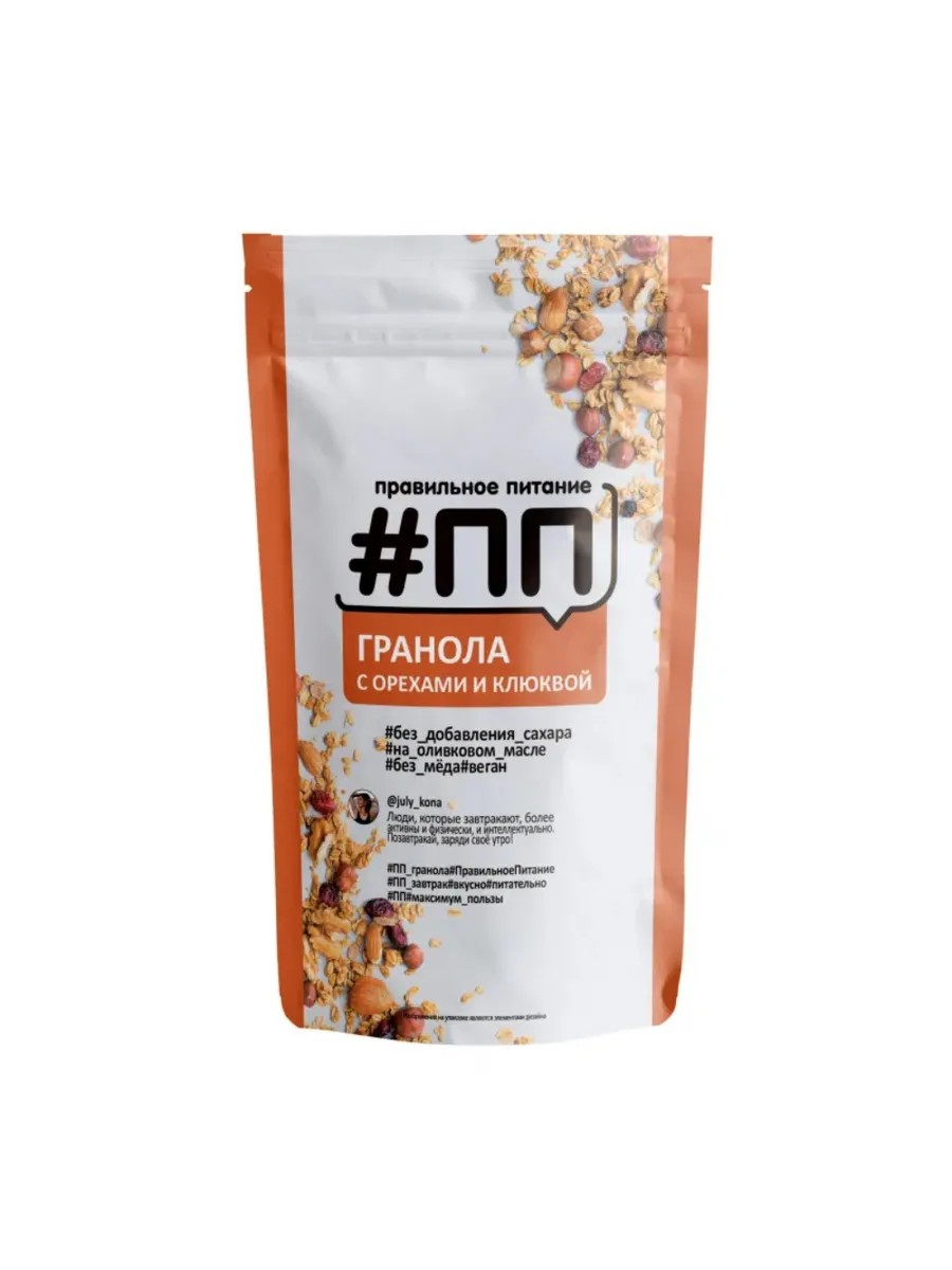 Granola #PP without sugar with nuts and cranberries, 350g. The combination of crunchy flakes, rich taste of nuts and slight sourness of dried cranberries will charge you with vivacity and energy for the whole day. Dietary fiber of cereals, vegetable protein and Omega-3 fatty acids of nuts, vitamin C of cranberries - this is a balanced combination of nutrients. The ideal formula for the start of the day. Nutritional value per 100 g of product: proteins - 10 g, fats - 17 g, carbohydrates - 55 g. Energy value per 100 g of product: 430 kcal / 1800 kJ. Store at a temperature of +5 to +25 and a relative humidity of no more than 75%. Features: - Vegan product. - Lenten product. - No preservatives. - No sugar. - No GMOs. - No honey. - In olive oil. - Convenient zip-lock packaging. Shelf life: 6 months.