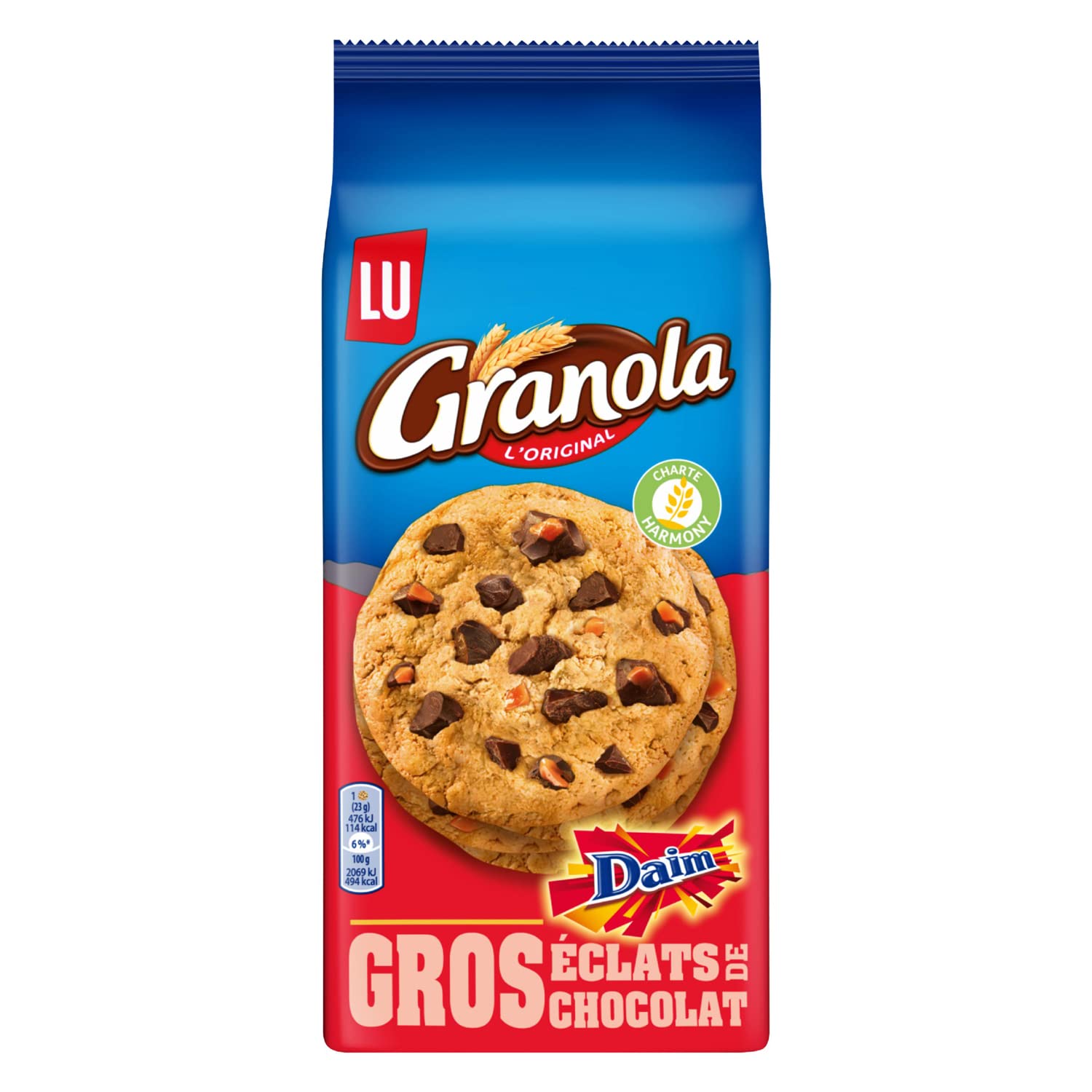 Fall for Granola Cookies Chocolate Daim, delicious cookies with large chocolate chips and Daim. Granola always hides something EXTRA! INGREDIENTS INGREDIENTS: WHEAT flour 35 , sugar, palm oil, chocolate 17 [sugar, cocoa mass, vegetable fats (palm, shea in varying proportions), dextrose, cocoa butter, emulsifier (SOY lecithins), cocoa butter, raising agents (ammonium carbonates, diphosphates, sodium carbonates), glucose syrup, salt, flavorings, cocoa mass, skimmed MILK powder, whole MILK powder, ALMONDS 0.3 , whey powder (from MILK), BUTTER, whey permeate (from MILK), OAT flakes, sweetened condensed skimmed MILK, color (beta-carotene), BUTTER, emulsifiers (SOY lecithins, sunflower lecithins), glazing agents (gum arabic, shellac).Delivery contents: Bag of 8 Extra Chocolate Daim Granola Cookies, Net weight: 184 g. Practical and easy-to-carry format thanks to its case of 8 cookies. Quality French wheat from the LU Harmony charter. Ideal for accompanying a coffee break or a gourmet snack to share with friends. Cookie with a crunchy texture and generous pieces of Daim and large melting chocolate chips for your gourmet breaks. Craquez pour Granola Cookies Chocolat Daim, de délicieux cookies aux gros éclats de chocolat et Daim. Granola, ça cache toujours quelque chose d'EXTRA ! INGRÉDIENTS INGREDIENTS :Farine de BLE 35 , sucre, huile de palme, chocolat 17 [sucre, pate de cacao,graisses végétales (palme, karité en proportions variables), dextrose, beurre de cacao, émulsifiant (lécithines de SOJA), beurre de cacao, poudres à lever (carbonates d'ammonium, diphosphates, carbonates de sodium), sirop de glucose, sel, arômes, päte de cacao, LAIT écrémé en poudre, LAIT entier en poudre, AMANDES 0,3 , lactosérum en poudre (de LAIT), BEURRE pâtissier, perméat de lactosérum (de LAIT), flocons d'AVOINE, LAIT écrémé concentré sucré, colorant (béta-carotène), BEURRE, émulsifiants (lécithines de SOJA, lécithines de tournesol), agents d'enrobage (gomme arabique, shellac).Contenu de la livraison : Sachet de 8 Extra Cookies Chocolat Daim Granola, Poids net : 184 g. Format pratique et facile à emporter grâce à son étui de 8 biscuits. Blé français de qualité issu de la charte LU Harmony. Idéal pour accompagner une pause café ou un goûter gourmand à partager entre amis. Cookie à la texture croustillante et aux généreux morceaux de Daim et gros éclats de chocolat fondants pour vos pauses gourmandes.