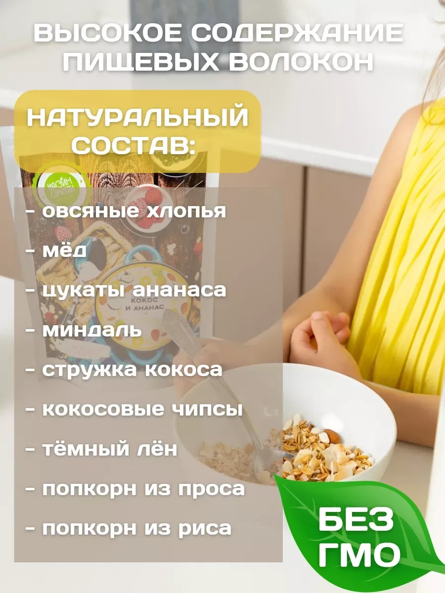 Гранола без сахара с кокосом и ананасом это экзотический вкус с орехами и цукатами. Запекаем специально отобранные овсяные хлопья с медом, добавляем миндаль ( витамины группы B ) и свежевысушенные цукаты сочного ананаса. Посыпаем запеченные мюсли кокосовой стружкой и семенами льна (Омега-3, Омега-6, Омега-9, источник растительной клетчатки). Завершаем ансамбль вкуса попкорном из пшена, жареными кокосовыми чипсами и рисовыми лепестками. Получается невероятно питательная еда без сахара и без глютена, утоляющая любой голод. Постная еда, которую можно в пост. Здоровое питание – залог здоровья и долголетия. Мюсли, запеченые хлопья – это правильное питание и здоровое меню. Натуральная гранола очень похожа на мюсли, но вкуснее в разы, всё из-за способа приготовления. Её запекают до хрустящего состояния и используют мёд. Это, безусловно, её большие плюсы и отличительные черты. Настин Сластин sugar free granola - это здоровое меню и очень универсальный продукт полезный для кишечника - это и постные сладости и полезный быстрый завтрак и диетическое питание и пп перекус и хлопья фитнесс, и сухой завтрак. Подходят и как постные продукты и как вегетарианские продукты. В порции КОКОС и АНАНАС содержится большое количество витаминов и минералов и клетчатки. Способов применения очень много. Помимо стандартного использования как полезный завтрак или снэк на полдник, её традиционно берут в походы, поскольку она мало весит и хорошо хранится. Подходит как здоровое питание и фитнес хлопья, пп, перекус без сахара и пп продукты, пп питание и фитнес-питание, протеиновые полезные сладости и сухой завтрак, для фитнеса и для похудения. Найди свое применение и ощути вкус полезной сладости из России.