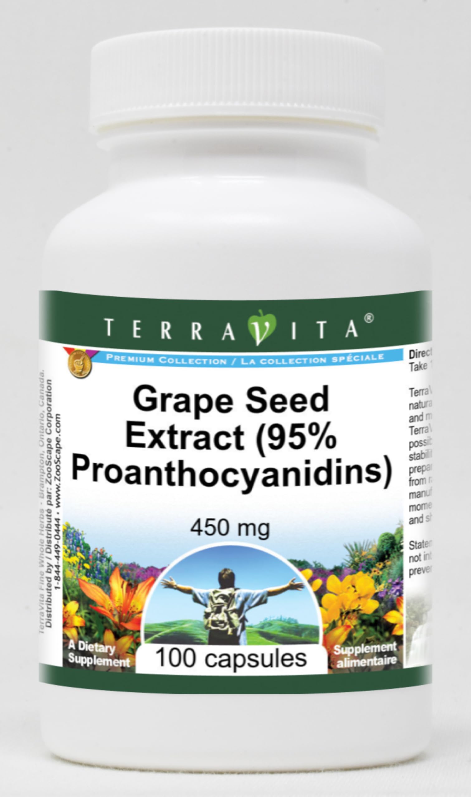 Grape Seed Extract (95 Proanthocyanidins) - 450 mg (100 capsules, ZIN: 520452) Packaged in the United States in a GMP certified facility (Good Manufacturing Practice). No fillers. Manufacturer: TerraVita Size: 100 capsules Easy-to-swallow Capsules in a sealed bottle. Ingredients: Gelatin, Water, Grape Seed 95 Extract - 450 mg