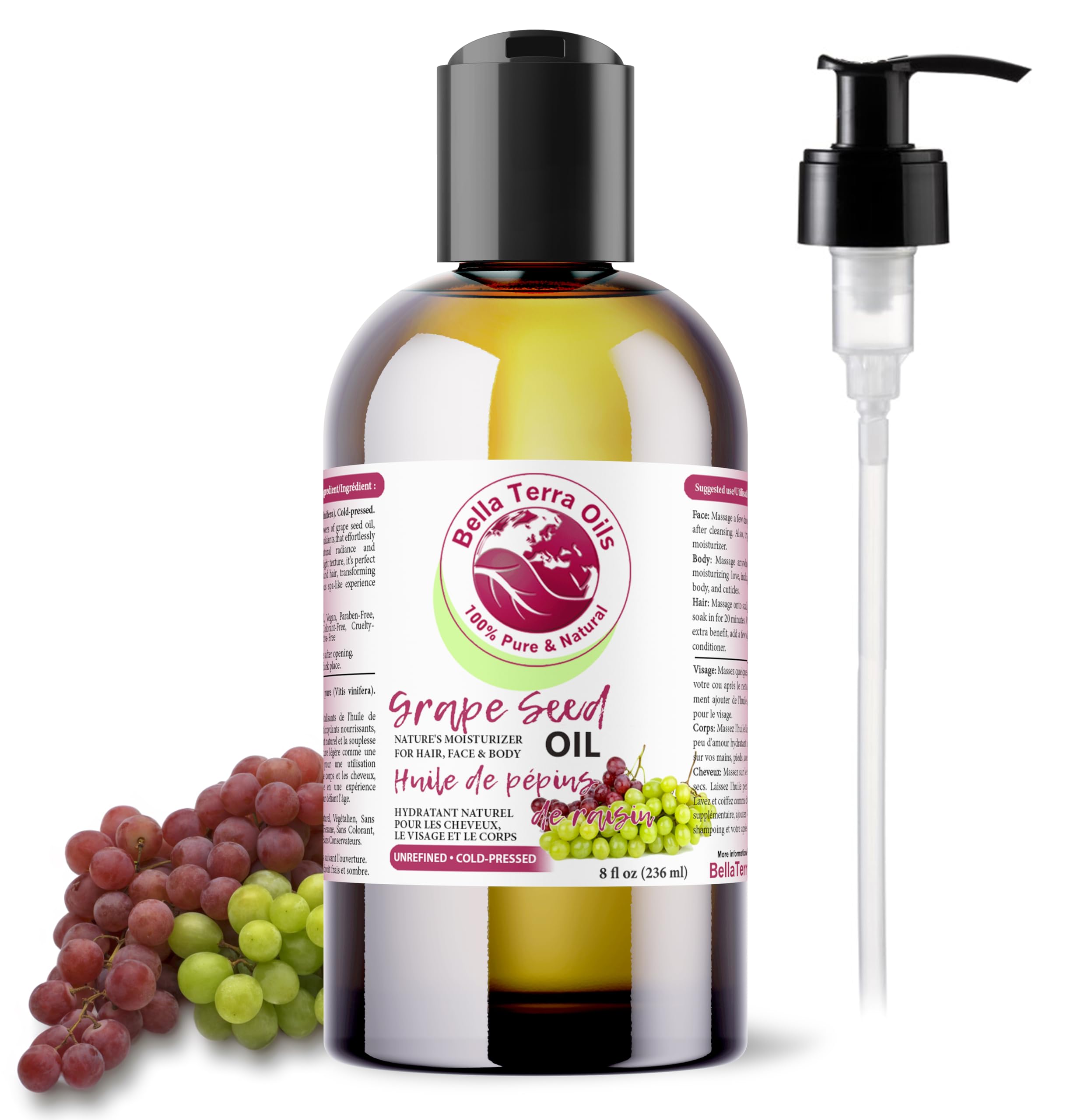 Grape Seed Oil. 236ml. 100% Pure. Cold-pressed. Unrefined. Organic. Rich in Vitamins. Chemical-free. Soothes Skin. Nourishes Hair. Natural Moisturizer for Hair Skin Nails Beard Stretch Marks. Bella Terra Oils. 236 ml (Pack of 1)