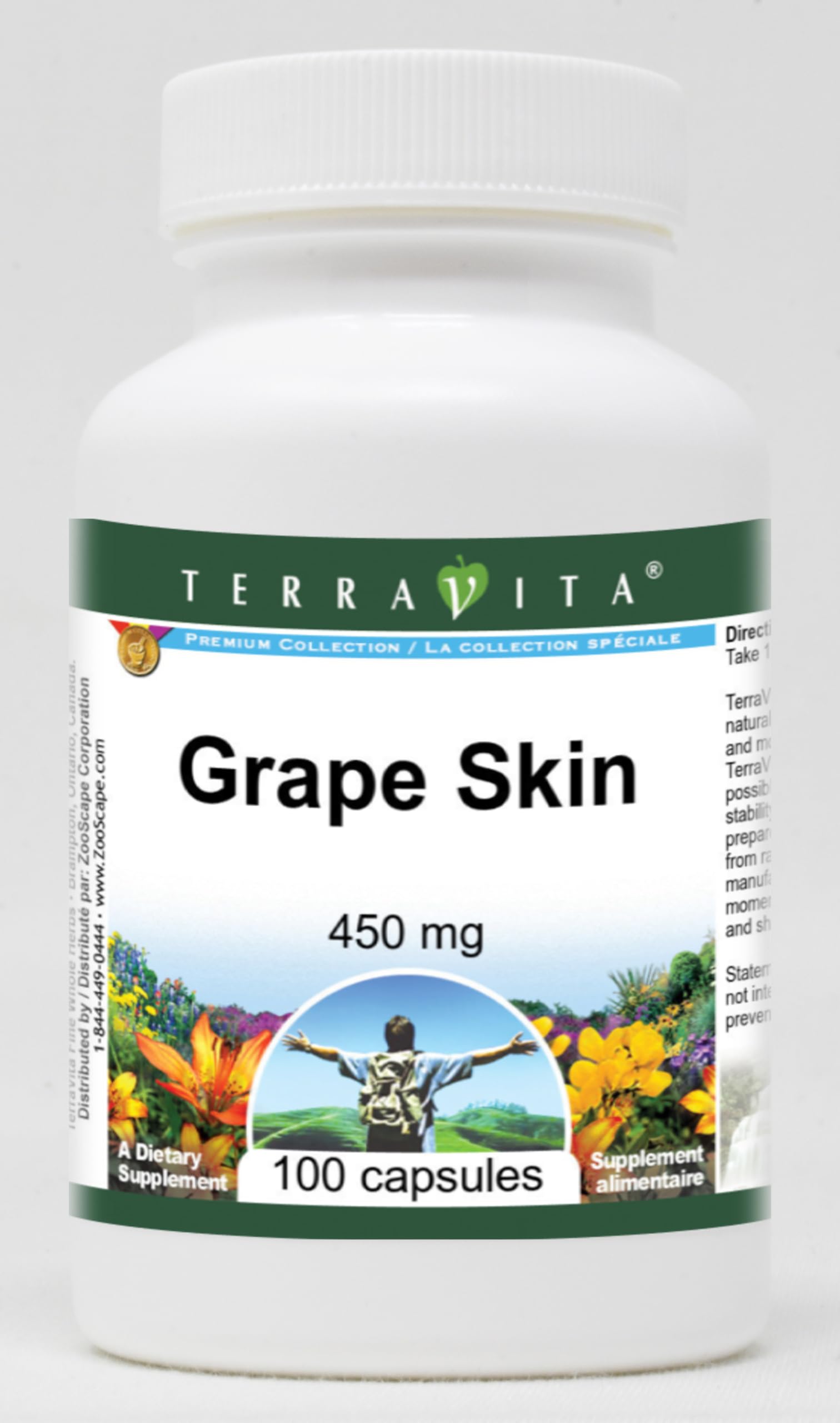 Grape Skin - 450 mg (100 capsules, ZIN: 514791) Packaged in the United States in a GMP certified facility (Good Manufacturing Practice). No fillers. Manufacturer: TerraVita Size: 100 capsules Easy-to-swallow Capsules in a sealed bottle. Ingredients: Gelatin, Water, Grape Skin - 450 mg