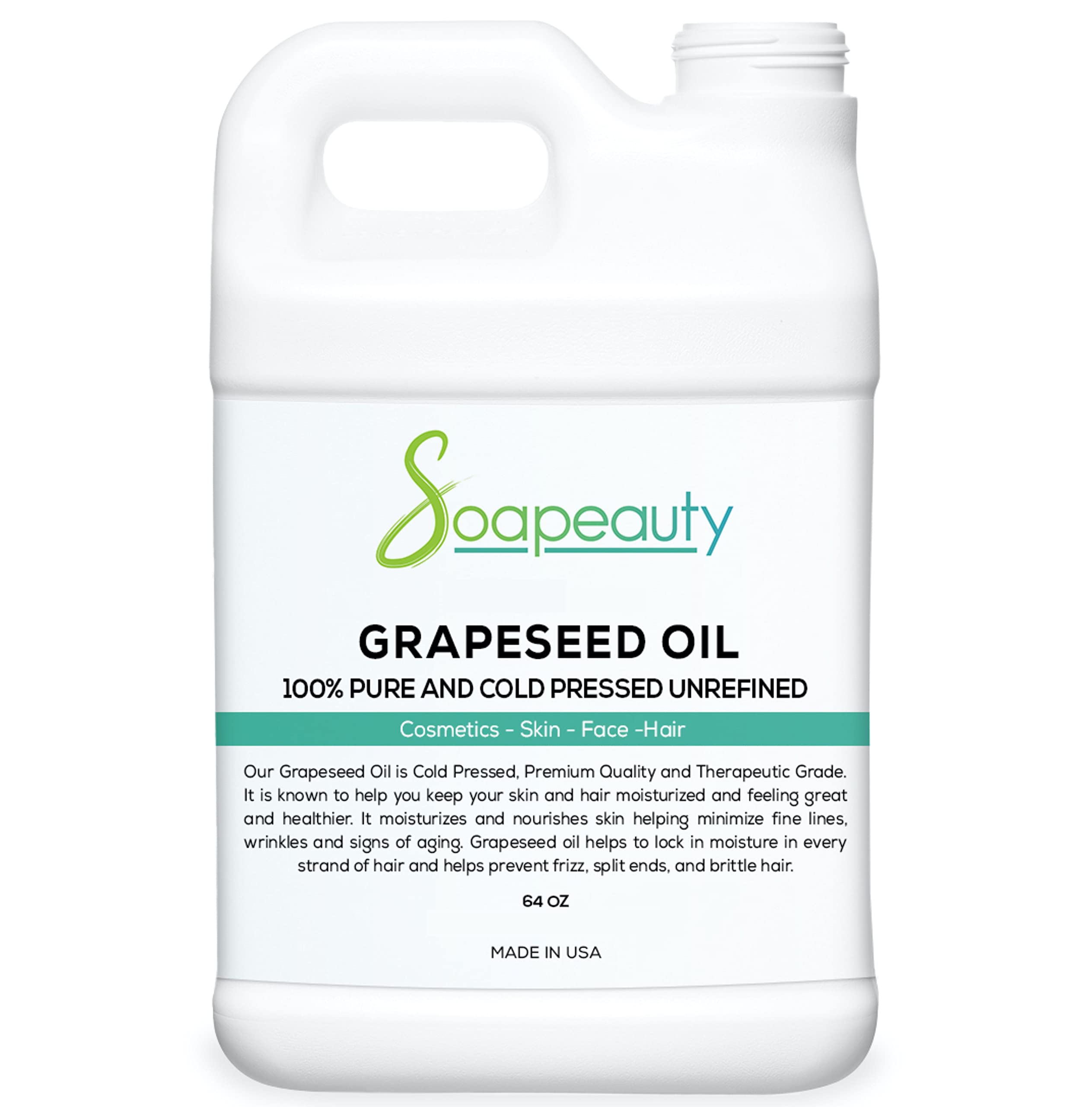 SOAPEAUTY PREMIUM GRAPESEED OIL: Organic Cold Pressed Unrefined 100 Pure Natural Grapeseed Oil with NO additives. Our Grapeseed Oil is great for massage, skin and hair care or as a carrier for essential oils. THINGS TO KNOW ABOUT GRAPESEED OIL: Great for Skin, Hair Nails Fast-Absorbing Non-Greasy Promotes Healthy Looking Skin Used to Treat Skin Conditions like Eczema Psoriasis Reduces Under Eye Circles Reduces Scars Blemishes Great for Hair Conditioner Hair Growth Massage Oil Ideal Carrier Oil NUTURE YOUR SKIN HAIR NATURALLY! Grapeseed Oil may be used to help naturally with skin troubles. Grapeseed Oil is rich in nutrients that make it perfect for moisturizing skin as well as hair to improve the overall health of skin and hair. Grapeseed Oil is also calming to use on skin to keep skin cool and even. TREAT YOUR SKIN: Grapeseed Oil is soothing to use on skin and may help improve skin concerns. The nutrients found in grape seed have skin calming properties and makes a gentle skin cleanser and moisturizer. It is often a popular choice for a massage oil. CARRIER FOR ESSENTIAL OILS: Requires a carrier oil such as Coconut Oil, Castor Oil, Sweet Almond Oil, Grapeseed Oil, etc. Since essential oils are so potent, they must be diluted before being applied to the skin. SATISFACTION QUALITY GUARANTEED: Soapeauty supplies bulk Grapeseed oil to some of the nations largest brands and we stand behind every product we sell.