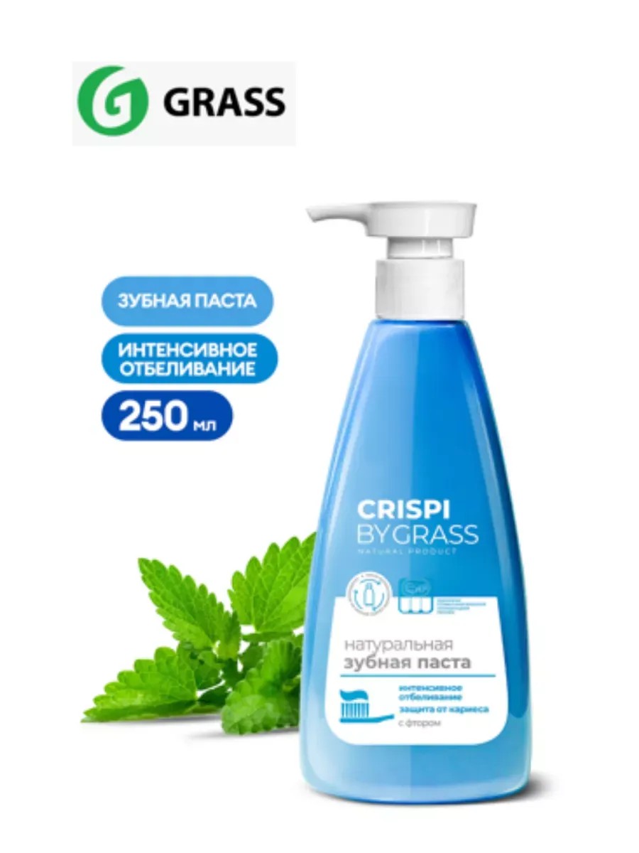 Grass, Crispi Whitening Toothpaste, 250 ml. Crispi whitening toothpaste from Grass, in gel form with a refreshing and invigorating mint flavor, gently cleans, restores and strengthens tooth enamel, reduces tooth sensitivity, gently and effectively cleans the surface of teeth, removes plaque, cares for oral health, improves aesthetics, and freshens breath. It helps remove plaque from tea, coffee, and cigarettes and prevents tartar buildup. Crispi toothpaste is a unique new format: toothpaste in a bottle with a dispenser. No need to squeeze out any more toothpaste; just press the pump. Make your daily brushing enjoyable! The pump packaging helps you use toothpaste economically. The gel dissolves and foams quickly. The bubbles of toothpaste envelop each tooth, penetrating the most hard-to-reach places, thereby reducing the risk of cavities. Large capacity: the bottle holds three regular tubes of toothpaste.