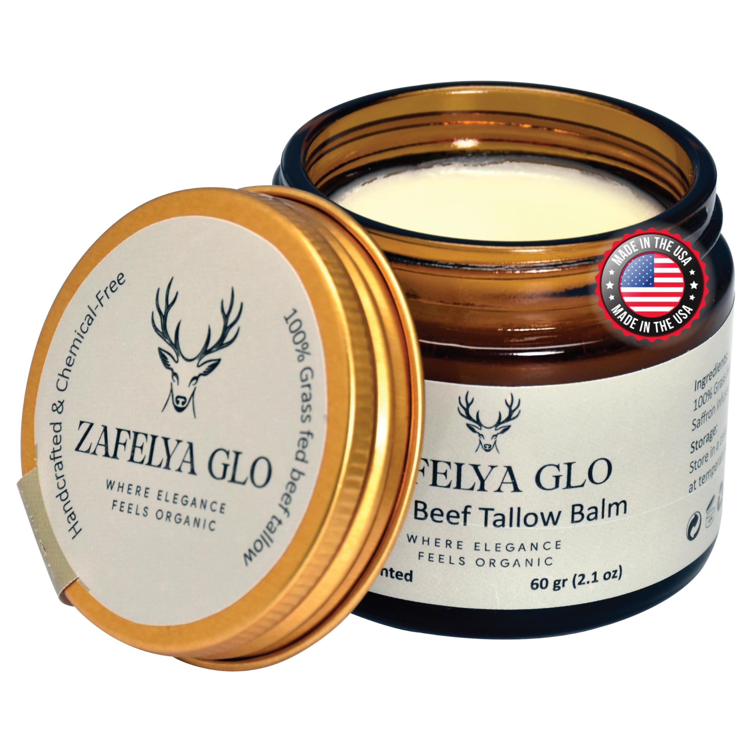 FAMILY-OWNED MADE IN THE USA: Handmade by our family-run business with care. If you're not happy with your purchase, simply contact us—your order is backed by our easy, no-questions-asked refund guarantee. SMALL-BATCH, PREMIUM QUALITY: At ZAFELYA GLO, we craft our balms in small batches using good quality, organic and clean, sustainable ingredients. Our carefully rendered and tallow ensures outstanding consistency in every jar. DEEPLY MOISTURIZES WITHOUT GREASE: Enjoy smooth, all-over hydration for face, hands, feet, and body for Mens, women or Everyone. Our balm absorbs quickly with no greasy or sticky feel, making it suitable for all skin types. NATURAL SKINCARE ALTERNATIVE: Switch from heavy, processed moisturizers to a clean, nature-inspired option. Our Honey Tallow Balm is crafted with Grass-Fed Beef Tallow, Jojoba Oil, Saffron Oil, and Raw Manuka Honey.
