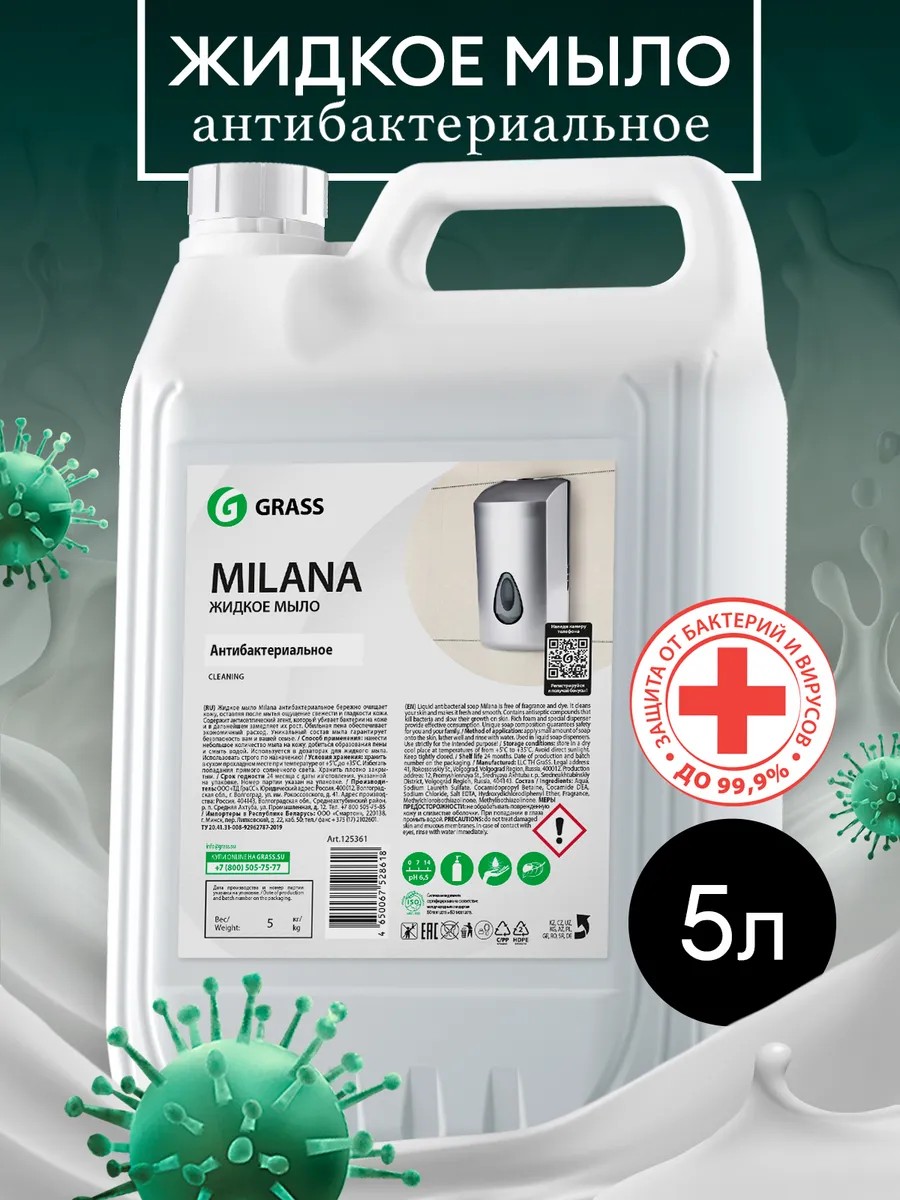 Жидкое мыло для рук с антисептическим эффектом Milana от Grass. Антибактериальное мыло дезинфицирующее Грасс 5 литров - создано на основе только высококачественных компонентов и природных увлажнителей, что обеспечивает деликатный уход за кожей. Подходит для бережной очистки рук и тела от любых загрязнений. Специальные компоненты в составе мыла защищают кожу от сухости, придают ей нежность и мягкость. Содержит антисептический агент, который убивает бактерии на коже и в дальнейшем замедляет их рост. Обильная пена обеспечивает экономичный расход. Профессиональное мыло для рук, не содержит красителей и ароматизаторов. Крем мыло подходит для ежедневного мытья рук. Соблюдая ежедневную гигиену рук вместе с мылом для рук Милана, вы не только увлажняете свою кожу, но также защищаете себя от бактерий.