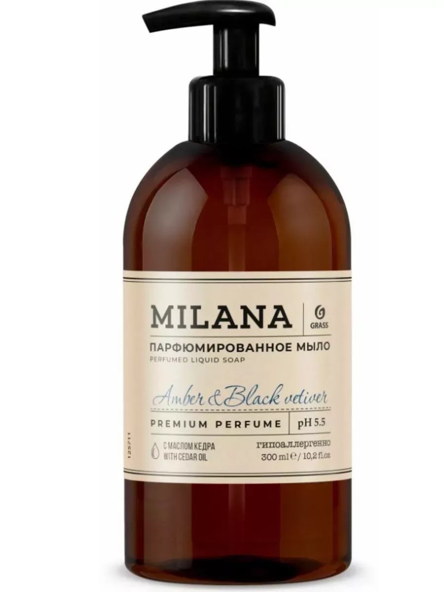 Жидкое мыло для рук GRASS Milana "Amber&Black Vetiver", 300 мл, парфюмированное, гипоаллергенное, крем-мыло - это парфюмированное мыло, созданное на основе мягких натуральных пенообразователей, нежно очищает кожу без вызова раздражения. Насыщенное маслом кедра, мыло предлагает дополнительный слой увлажняющих и питательных свойств. Изысканный букет острого ветивера и теплой амбры оставляет приятный аромат, который сохраняется на длительное время. Наслаждайтесь бархатистым ощущением жидкого мыла ГРАСС Милана, которое поддерживает естественный PH-баланс вашей кожи, оставляя ее мягкой и обновленной. Данный продукт идеально подходит для ежедневного умывания, мытья рук и купания (можно использовать в качестве геля для душа), Милана крем мыло – это не просто мыло, это ежедневная роскошь, которую вы заслуживаете. В этой линейке парфюмированных средств вы также можете найти мыло жидкое для рук с ароматом "Patchouli&Grapefruit", обладающее аналогичными свойствами.