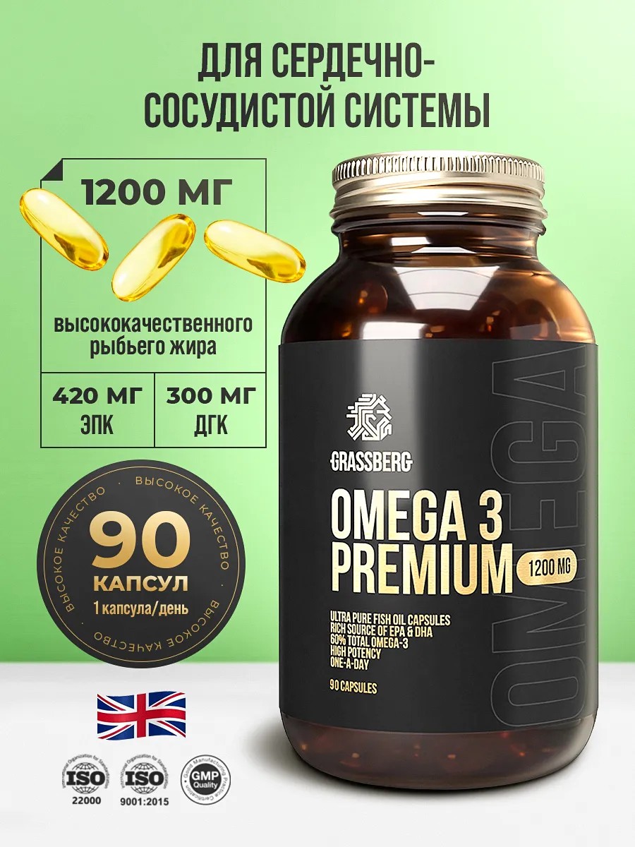 GRASSBERG это гарантированный вклад в здоровье. Omega 3 GRASSBERG это гарантированный вклад в здоровье. Omega 3 Premium 60% 1200 mg – это дополнительный источник витамина Е и полиненасыщенных жирных кислот (эйкозапентаеновой и докозагексаеновой кислоты), рекомендована к каждодневному приему, для восполнения дефицита омега 3 в организме. Содержит полиненасыщенных жирных кислот (ПНЖК) Omega 3 Premium
