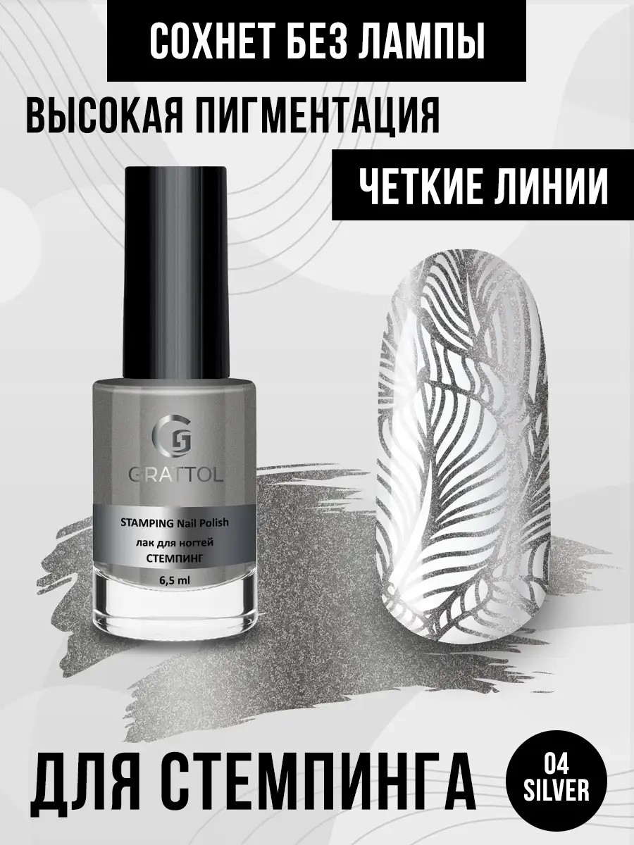 Высокопигментированный быстросохнущий лак для стемпинга Граттол. Не нуждается в сушке в лампе. Краска благодаря быстрой скорости высыхания воспроизводит рисунок с трафарета для стемпинга четко, не смазывая узор. Лак переносит даже мельчайшие линии и детальные изображения, которые невозможно аккуратно нарисовать от руки при помощи кисти для росписи ногтей. После исполнения дизайна ногтей требуется закрепить рисунок топом для ногтей или закрепителем. Если лак не печатает - рекомендуем наработать технику стемпинга, также возможно забафить штамп, если он имеет слишком глянцевую поверхность (как некоторые прозрачные штампы, особенно новые).
