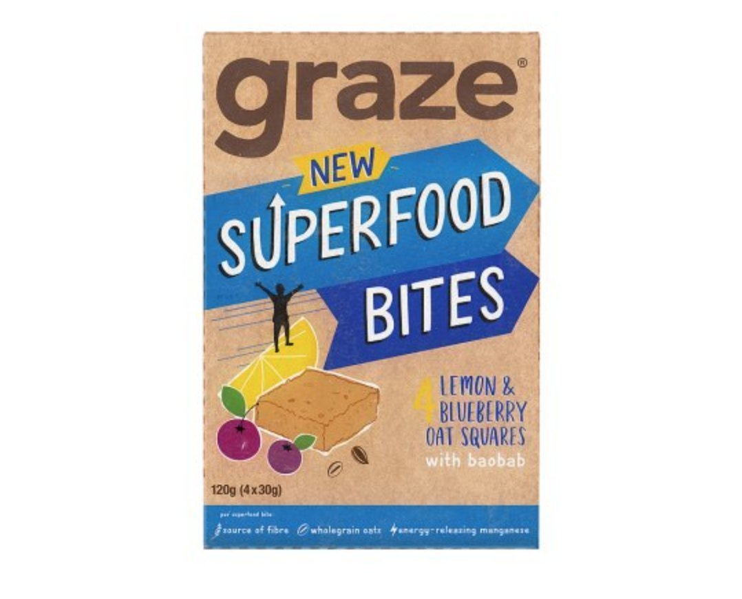 Give your afternoons a little tasty boost with oats, lemon, blueberry-infused cranberries and superfood baobab. This superhero recipe is made with chicory root fiber, a naturally sweet ingredient that means this recipe uses 40 less sugar and still hits the sweet spot. We compared this recipe to over 80 other similar cereal bars to get this percentage INGREDIENTS Rolled oats (43 ), margarine (vegetable oils [palm, rapeseed], water, salt), chicory root fiber, dried cranberries infused with blueberries (10 ) (sugar, cranberries, grape juice concentrate, blueberry juice concentrate, sunflower oil), demerara sugar (sugar, cane molasses), golden syrup, sunflower seeds, pumpkin seeds, baobab powder (10 ) 0.5 ), lemon curd (1 ) (sugar, salted butter [milk], lemon juice, pasteurized free-range egg yolk, pasteurized whole egg, acidity regulator: citric acid, gelling agent: citrus pectin, lemon oil), natural lemon flavor, emulsifier: sunflower lecithinCountry of Origin: United Kingdom. At Graze, we're on a mission to make better choices more exciting. Using wholesome ingredients, our favorite flavors, and feedback from our grazers, we create delicious snacks you can feel good about. What if you gave your favorite flapjack a boost? No artificial colors, flavors, or preservatives. Suitable for vegetarians. Donnez à vos après-midi un petit coup de pouce savoureux avec de l'avoine, du citron, des canneberges infusées à la myrtille et du baobab superalimentaire. Cette recette de super-héros est fabriquée avec de la fibre de racine de chicorée, un ingrédient naturellement sucré qui signifie que cette recette utilise 40 de sucre en moins et atteint toujours l'endroit sucré. Nous avons comparé cette recette à plus de 80 autres barres de céréales similaires pour obtenir ce pourcentage INGRÉDIENTS Avoine roulée (43 ), margarine (huiles végétales [palme, colz], eau, sel), fibre de racine de chicorée, canneberges séchées infusées aux myrtilles (10 ) (sucre, canneberges, concentré de jus de raisin, concentré de jus de myrtille, huile de tournesol), sucre demerara (sucre, mélasse de canne), sirop doré, graines de tournesol, graines de citrouille, poudre de baobab (10 ) 0,5 ), citron caillé (1 ) (sucre, beurre salé [lait], jus de citron, jaune d'œuf pasteurisé libre portée, œuf entier pasteurisé, régulateur d'acidité : acide citrique, gélifiant : pectine d'agrumes, huile de citron), arôme naturel de citron, émulsifiant : lécithine de tournesolPays d'origine : Royaume-Uni. Chez Graze, nous avons pour mission de rendre de meilleurs choix plus excitants. En utilisant des ingrédients sains, nos saveurs préférées et les commentaires de nos grazers, nous créons de délicieuses collations dont vous pouvez vous sentir bien. Que se passe-t-il si vous donnez un coup de pouce à votre flapjack préféré ?. Sans colorants, arômes ou conservateurs artificiels. Convient aux végétariens.