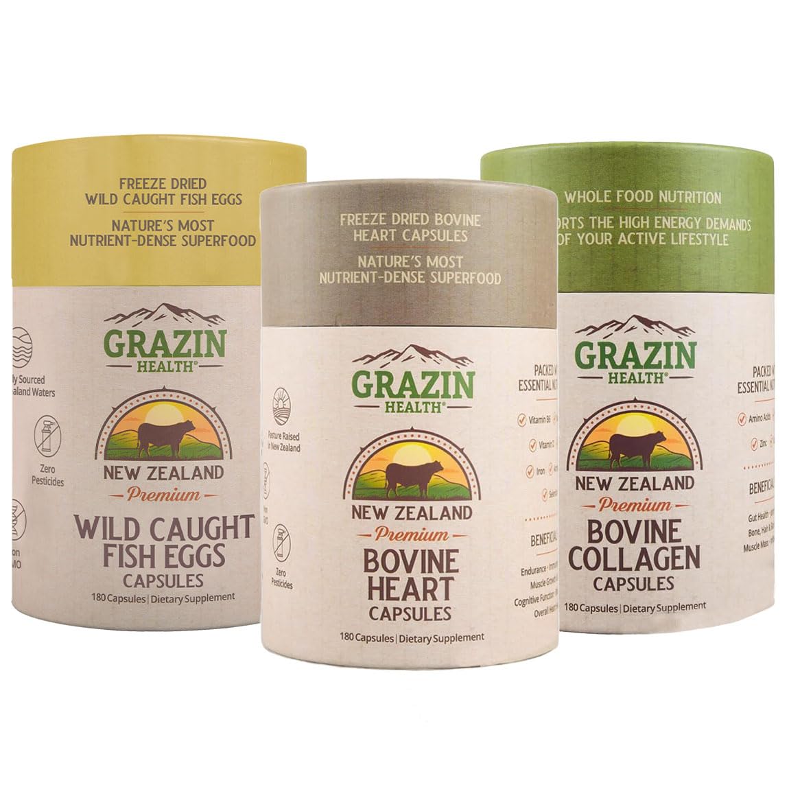 The GRAZIN HEALTH Cardio Performance Bundle brings together three whole-food supplements that simplify everyday nutrition: Heart Capsules, Fish Eggs Capsules, and Hydrolyzed Collagen Capsules. Each is crafted from clean, transparent sources and designed to fit into modern, busy routines. The Heart Capsules feature 3,000 mg of bovine heart and 200 mg of liver per serving, sourced from 100 grass-fed New Zealand cattle. The Fish Eggs Capsules include 3,000 mg of wild-caught fish roe per serving, a natural source of omega-3 fatty acids, DHA, and EPA. The Collagen Capsules complete the bundle, offering hydrolyzed collagen peptides in a simple capsule—no powders or mixing required. Together, these three supplements offer a practical way to maintain a consistent whole-food wellness routine. With no artificial colors, sweeteners, or additives, this Cardio Performance Bundle embodies GRAZIN HEALTH's commitment to quality, simplicity, and clean daily living.Heart Capsules – 3,000 mg per serving: Each serving delivers 3,000 mg of grass-fed bovine heart and 200 mg of liver, sourced from New Zealand pasture-raised cattle. A convenient way to add organ-based, food-derived nutrition to your daily routine without prep or blending. Three essentials, one bundle: The GRAZIN HEALTH Cardio Performance Bundle includes Heart Capsules, Fish Eggs Capsules, and Hydrolyzed Collagen Capsules—a simple, whole-food combination designed for everyday wellness. Easy to take, easy to remember, and free from artificial flavors, colors, or sweeteners. Includes: GRAZIN HEALTH Collagen Capsules – Hydrolyzed Collagen Supplement for Skin, Hair, Nails Joint Support – Daily Beauty Wellness Capsules – 30 Servings. Includes: GRAZIN HEALTH Fish Eggs Capsules – 3000mg Per Serving Omega-3, DHA EPA Rich Fish Roe Supplement with Essential Fatty Acids for Heart, Brain, Immune Daily Nutrition Support – 30 Servings. Includes: GRAZIN HEALTH Grass Fed Bovine Heart Capsules: 3000 Mg Heart 200 Mg Liver Serving (30 Servings).