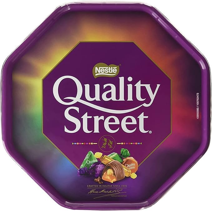 Nestlé Quality Street Assortment of milk and dark chocolates and caramels. Remember to enjoy chocolate as part of a varied and balanced diet and a healthy lifestyle. The chocolate used in Quality Street has been produced under the Nestlé Cocoa Plan, which works with UTZ Certified to support cocoa farmers for better chocolate. Now with the new chocolate caramel brownie. Sometimes it's necessary to replace one sweet with another of equal quality. A variety of your favorite iconic sweets individually wrapped. Delicious milk and dark chocolates, caramels, and fruit creams. Perfect for sharing at Christmas and other celebrations. Includes the famous Green Triangle and Purple One, as well as the new chocolate caramel brownie. No artificial colors, flavors, or preservatives. Quality Street is suitable for vegetarians. Pack size: 650g. Ingredients: Sugar, glucose syrup, cocoa mass, vegetable fats (palm, rapeseed, sunflower, coconut, mango kernel sal shea), sweetened condensed skimmed milk (skimmed milk, sugar), cocoa butter, dried whole milk, glucose, rum system, coconut, lactose and whey proteins (from milk), whey powder (from milk), hazelnuts, skimmed milk powder, butter (from milk), emulsifiers (sunflower lecithin, E471), flavorings, butterfat (from milk), fat-reduced cocoa powder, salt, lactic acid. Milk chocolate contains a minimum of 14 milk solids. Milk and dark chocolate contain vegetable fats. In addition to cocoa butter.Nestle Quality Street Boîte à chocolat pour Noël 600 gDESCRIPTION DU PRODUIT Nestle Quality Street Assortiment de chocolats au lait et noirs et caramels. N'oubliez pas de profiter du chocolat dans le cadre d'une alimentation variée et équilibrée et d'un mode de vie sain. Le chocolat utilisé dans Quality Street a été produit dans le cadre du plan Nestlé Cocoa, qui travaille avec UTZ Certified pour soutenir les producteurs de cacao pour un meilleur chocolat. Maintenant avec le nouveau brownie au chocolat et au caramel Il est parfois nécessaire de remplacer un bonbon par un autre de qualité égale. Une variété de vos bonbons emblématiques préférés emballés individuellement. Délicieux chocolats au lait et noirs, caramels et crèmes de fruits. Parfait pour partager à Noël et d'autres célébrations. Comprend le célèbre triangle vert et le Purple One « ainsi que le nouveau brownie au chocolat et au caramel » Sans colorants, arômes ou conservateurs artificiels Quality Street convient aux végétariens. Taille du paquet : 650 g. Ingrédients : sucre, sirop de glucose, pâte de cacao, graisses végétales (palme, colza, tournesol, noix de coco, noyau de mangue sal karité), lait écrémé condensé sucré (lait écrémé, sucre), beurre de cacao, lait entier séché, glucose Systèmes de ructose rup, noix de coco, lactose et protéines de lactosérum (à partir de lait), poudre de lactosérum (à partir de lait), noisettes, lait écrémé en poudre, beurre (de lait), émulsifiants (lécithine de tournesol, E471), arômes, graisse de beurre (du lait), poudre de cacao réduite en graisse, sel, acide lactique, chocolat au lait contient 14 de solides de lait minimum, lait et chocolat noir contient des graisses végétales En plus du beurre de cacao
