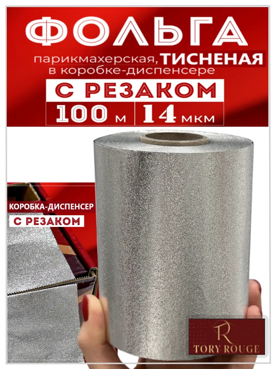 Фольга тисненая 100 м 14 мкм в коробке диспенсере с отрезным ножом "резаком" — это необходимый аксессуар для различных техник окрашивания и мелирования волос.