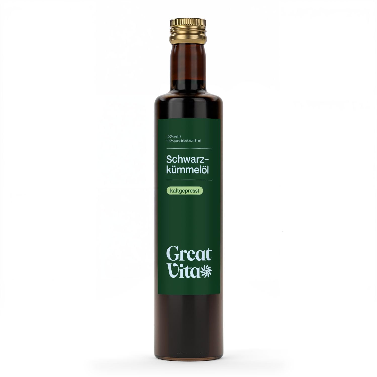 GreatVita Black Seed Oil - 100 Pure and Cold-Pressed for Your Health and Cooking Discover the purity and versatility of GreatVita Black Seed Oil, cold-pressed and free of any artificial additives. Our oil is free of MSG, flavor enhancers, colors, flavors, and preservatives to offer you the most natural quality. It contains no fillers such as salt, dextrose, starch, or sugar and remains in its purest (filtered) form. Cold-pressed black seed oil is rich in essential nutrients such as biotin, folic acid, magnesium, and vitamins B1, B2, B6, C, and E, thus supporting a healthy diet. With up to 70 unsaturated fatty acids, it provides an excellent base for caring for your hair and skin. Use it pure or diluted to nourish and revitalize your hair ends. In addition to its health benefits, GreatVita Black Seed Oil is an exquisite spice oil that gives your dishes an oriental aroma. Ideal for enhancing salads, marinades, or sauces, just a few drops are enough to add flavor to your food. Product Highlights: Cold-pressed from genuine black cumin (Nigella sativa). 100 pure, with no artificial additives. Rich in unsaturated fatty acids (up to 70 ). Perfect as a spice oil with an oriental flavor profile. Versatile use in cooking and natural skin and hair care. Our commitment to quality is reflected in the natural nature of our products, which may be subject to slight variations depending on the season, harvest yield, and growing conditions. Trust GreatVita for pure, natural black seed oil that supports your health and culinary creations. INGREDIENTS Black Seed Oil (Nigella sativa) DIRECTIONS 2-3 x 1 2 to 1 teaspoon daily for cooking and skincare See moreGreatVita Huile de nigelle 500 ml – 100 pure, pressée à froid, filtrée, polyvalente pour la cuisine et les soins de la peau, sans additifs, l'impression peut varierDESCRIPTION DU PRODUIT DESCRIPTION DU PRODUIT Huile de nigelle GreatVita - 100 pure et pressée à froid pour votre santé et votre cuisine Découvrez la pureté et la diversité de l'huile de nigelle GreatVita, pressée à froid et sans aucun additif artificiel. Notre huile est exempte de glutamate, d'exhausteurs de goût, de colorants, d'arômes et de conservateurs pour vous offrir la qualité la plus naturelle. Elle ne contient pas de charges telles que le sel, le dextrose, l'amidon ou le sucre et reste dans sa forme la plus pure (filtrée). L'huile de nigelle pressée à froid est riche en nutriments essentiels tels que la biotine, l'acide folique, le magnésium et les vitamines B1, B2, B6, C et E et soutient ainsi une alimentation saine. Avec jusqu'à 70 d'acides gras insaturés, elle offre une excellente base pour prendre soin de vos cheveux et de votre peau. Utilisez-le pur ou dilué pour nourrir et revitaliser vos pointes de cheveux. Outre ses bienfaits pour la santé, l'huile de nigelle GreatVita est une huile épicée exquise qui donne à vos plats un arôme oriental. Idéal pour affiner des salades, des marinades ou des sauces, quelques gouttes suffisent pour ajouter de la saveur à vos aliments. Points forts du produit : Pressée à froid en véritable cumin noir (Nigella sativa). 100 pure, sans additifs artificiels. Riche en acides gras insaturés (jusqu'à 70 ). Parfaite comme huile d'épices avec un profil de goût oriental. Utilisation polyvalente dans la cuisine et soin naturel de la peau et des cheveux. Notre engagement envers la qualité se reflète dans la nature naturelle de nos produits, qui peuvent être soumis à de légères variations en fonction de la saison, du rendement de la récolte et des conditions de production. Faites confiance à GreatVita pour une huile de nigelle pure et naturelle qui soutient votre santé et vos créations culinaires. INGRÉDIENTS Huile de nigelle (Nigella sativa) MODE D'EMPLOI 2-3 x 1 2 à 1 cuillère à café par jour pour la cuisine et les soins de la peau Voir plus