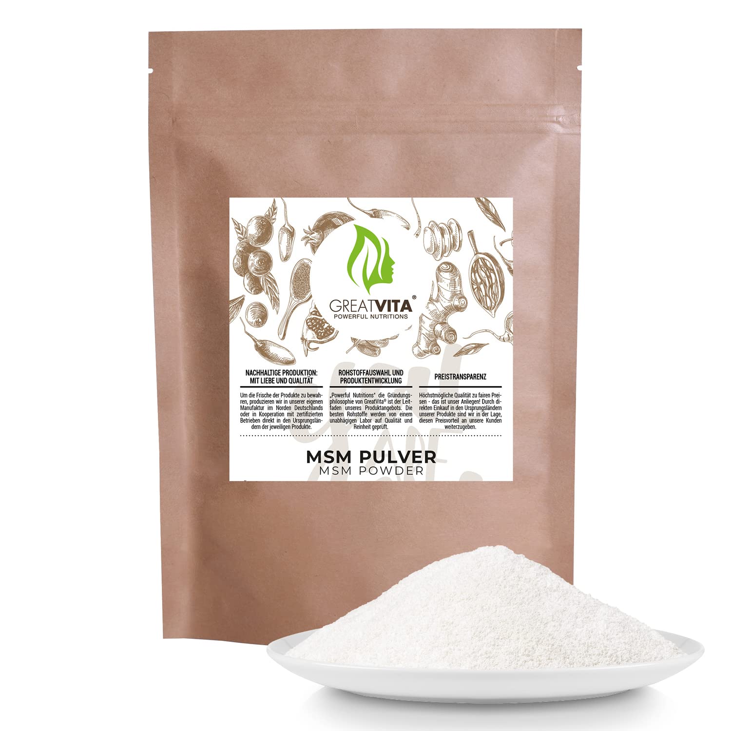 MSM Powder - GreatVita Fine powder, neutral blend, simple routine: our MSM powder is for you if you like it easy. 99.9 food-grade methylsulfonylmethane, neutral in taste and with no additives - it blends seamlessly into water, juices, or smoothies without masking the texture or taste. Keep your daily routine simple: stir, and it's ready. The fine powder dissolves easily, is measured with a teaspoon, and mixes well into both hot and cold drinks. Suitable for shakers, glasses, or stirrers. Transparent quality declaration: white powder, gluten-free, sugar-free, filler-free, and non-GMO. Clear ingredient list: 99.9 MSM - nothing more, because there's nothing more to it. Many also know MSM as "sulfur" it is methylsulfonylmethane, an organic sulfur compound. Easy to use: Simply mix into water, juice, or smoothies. Choose the amount and frequency according to your personal preference or the instructions on the packaging. Combinations (e.g., with lemon juice) are a matter of taste. Convenient to keep in stock: The pack provides ample supply without the need for constant reordering. After opening, store in a dry place and reseal tightly – the powder remains free and ready to use at any time. INGREDIENTS 100 Pure MSM Powder DIRECTIONS Approximately 2g of MSM powder daily – for example, B. Mix 2 x ½ level teaspoons daily into a cold drink or dish. See moreEasy to use and clean: The fine, free-flowing MSM powder dissolves easily in both hot and cold drinks and fits perfectly into your daily routine. Easy to use: Many people use MSM sulfur with vitamin C. Simply mix it into water, juice, or smoothies – stir, drink, and you're done. Good to carry: Gluten-free, sugar-free, filler-free, and genetically modified. Often also sought after as sulfur powder – with us, you get only the essentials for your daily routine. Versatile: High-dose MSM in a convenient pouch. It's easy to measure with the teaspoon and has a neutral taste, ideal for long-term use without the need for constant reordering. Safe: 99.9 pure MSM in fine powder form. Mixes easily into water, juice, or smoothies – fitting seamlessly into your daily routine without altering the taste.GreatVita Poudre de MSM 400 g 99,9 pur Qualité supérieure Méthylsulfonylméthane, soufre organique sans additifs 400g (1er Pack)DESCRIPTION DU PRODUIT DESCRIPTION DU PRODUIT Poudre MSM - GreatVita Poudre fine, mélange neutre, routine claire : notre poudre MSM est faite pour vous si vous l'aimez facilement. 99,9 de méthylsulfonylméthane de qualité alimentaire, neutre au goût et sans additifs - Se glisse dans l'eau, les jus ou les smoothies sans masquer la texture ou le goût. Votre quotidien reste simple : remuer, c'est prêt. La poudre fine se dissout bien, se dosant avec une cuillère à café et se mélange dans des boissons froides et tièdes. Convient pour shaker, verre ou cuillère à mélanger. Qualité transparente déclarée : poudre blanche, sans gluten, sans sucre, sans agents de remplissage et sans OGM. Liste claire des ingrédients : 99,9 de MSM - Il n'y a rien de plus parce qu'il n'y a plus à faire. Beaucoup connaissent également le MSM sous le nom de « soufre » c'est le méthylsulfonylméthane, un composé organique soufre. Utilisation facile : il suffit de mélanger dans l'eau, le jus ou les smoothies. Choisissez la quantité et la fréquence selon vos préférences personnelles ou selon les instructions sur l'emballage. Combinaisons (par exemple par exemple avec du jus de citron) sont une question de goût. Pratique en stock: le pack offre une longue portée sans avoir à commander en permanence. Après ouverture, conserver au sec et bien refermer - la poudre reste libre et prête à l'emploi à tout moment. INGRÉDIENTS Poudre MSM 100 pure MODE D'EMPLOI Chaque jour environ Prendre 2 g de poudre de MSM – par exemple B. Mélanger 2 × chaque ½ cuillère à café rasée par jour dans une boisson froide ou un plat. Voir plusFacile à utiliser et à nettoyer : la fine poudre msm fluide se dissout bien dans les boissons froides comme chaudes et s'intègre parfaitement dans votre vie quotidienne. Utilisation facile : beaucoup utilisent du soufre msm avec de la vitamine C. Mélangez-le dans de l'eau, du jus ou des smoothies et faites-le confortablement : mélangez, buvez, c'est prêt. Agréable à porter : sans gluten, sans sucre, charges et génie génétique. Souvent également recherché sous forme de poudre de soufre – chez nous, vous n'obtenez que l'essentiel pour votre routine quotidienne. Polyvalent : MSM hautement dosé dans un sac pratique. Il est facile à doser avec la cuillère à café et est neutre au goût, idéal pour une longue portée sans avoir à commander en permanence. Sans danger : 99,9 de msm pur que la poudre fine. Se mélange facilement dans l'eau, le jus ou les smoothies - S'intègre à votre routine quotidienne sans en altérer le goût.