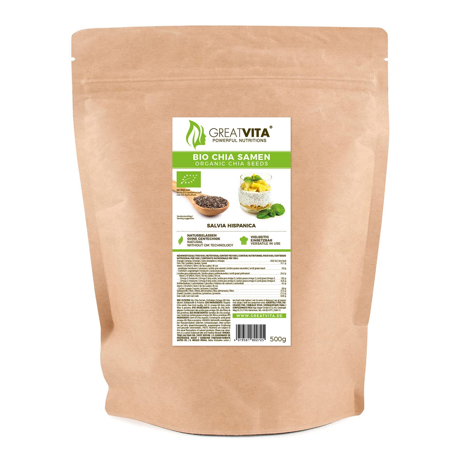 Greatvita Bio Chia seeds Chia seeds can easily be scattered, for example, via salads, fruits or spreads or in dressings, mueslis, soups, smoothies, yoghurts or baking mixes. The seeds contain up to 38 percent chia oil and 18 - 23 percent high -quality protein and vitamins (vitamin A, niacin, thiamine, riboflavin), minerals (calcium, phosphorus, potassium, zinc and copper), as well as valuable antioxidants. The special thing about organic chia seeds is their high content of valuable omega-3 and omega-6 fatty acids in the ideal ratio of about 3: 1. Soaked, roasted or ground - Chia was considered a popular food in Central America (next to quinoa). ✓ Calorie and low in fat ✓ REALY OF VITAMINES ✓ 100 percent bio quality ✓ Raw food quality The chia plant (Salvia Hispanica) originally comes from Mexico and parts of South and Central America.Even with the Aztecs, the small, black and white seeds were an important part of food. Our chia seeds are natural, naturally gluten -free and without genetic engineering. Ingredients ingredients Organic chia seeds Instructions Not applicable Warnings no Address manufacturer importer Ingo Steyer KG, Oestinger Weg 35, 21745 Hemmoor MoreYou contain up to 38 chia oil and 18 - 23 high -quality protein and vitamins, minerals, as well as valuable antioxidants.Our organic chia seeds can be soaked, roasted or ground.The seeds have an extremely versatile and uncomplicated use in dressings, soups, smoothies, yoghurts or baking mixes.Our organic chia seeds are natural and grown without genetic engineering.Contain valuable protein, antioxidants, natural omega -3 6 -fatty acids and fiber.GreatVita Bio Chia Samen Chia-Samen können ganz einfach beispielsweise über Salate, Früchte oder Brotaufstriche gestreut oder in Dressings, Müslis, Suppen, Smoothies, Joghurts oder Backmischungen gegeben werden. Die Samen enthalten bis zu 38 Procent Chiaöl und 18 - 23 Procent hochwertiges Protein und Vitamine (Vitamin A, Niacin, Thiamin, Riboflavin), Mineralien (Kalzium, Phosphor, Kalium, Zink und Kupfer), sowie wertvolle Antioxidantien. Das Besondere an Bio Chia-Samen ist ihr hoher Gehalt an wertvollen Omega-3- und Omega-6-Fettsäuren im idealen Verhältnis von etwa 3:1. Eingeweicht, geröstet oder gemahlen – Chia galt in Mittelamerika (neben Quinoa) als beliebte Kost. ✓ kalorien- und fettarm ✓ reich an Vitaminen ✓ 100 Procent Bio Qualität ✓ Rohkostqualität Die Chiapflanze (Salvia hispanica) stammt ursprünglich aus Mexiko sowie Teilen Süd- und Zentralamerikas. Schon bei den Azteken waren die kleinen, schwarzen und weißen Samen ein wichtiger Bestandteil der Nahrung. Unsere Chia Samen sind naturbelassen, von Natur aus glutenfrei und ohne Gentechnik angebaut. INHALTSSTOFFE ZUTATEN Bio Chia Samen GEBRAUCHSANWEISUNG Nicht zutreffend WARNHINWEISE keine ANSCHRIFT HERSTELLER IMPORTEUR Ingo Steyer KG, Oestinger Weg 35, 21745 Hemmoor MehrSie enthalten bis zu 38 Chiaöl und 18 - 23 hochwertiges Protein und Vitamine, Mineralien, sowie wertvolle Antioxidantien. Unsere Bio Chia Samen können eingeweicht, geröstet oder gemahlen verzehrt werden. Die Samen haben eine äußerst vielseitige und unkomplizierte Verwendung in Dressings, Suppen, Smoothies, Joghurts oder Backmischungen. Unsere Bio Chia Samen sind naturbelassen und ohne Gentechnik angebaut. enthalten wertvolles Eiweiß, Antioxidantien, natürliche Omega -3 6 –Fettsäuren und Ballaststoffe.GreatVita Bio Chia Samen, 500g naturbelassen ohne Gentechnik