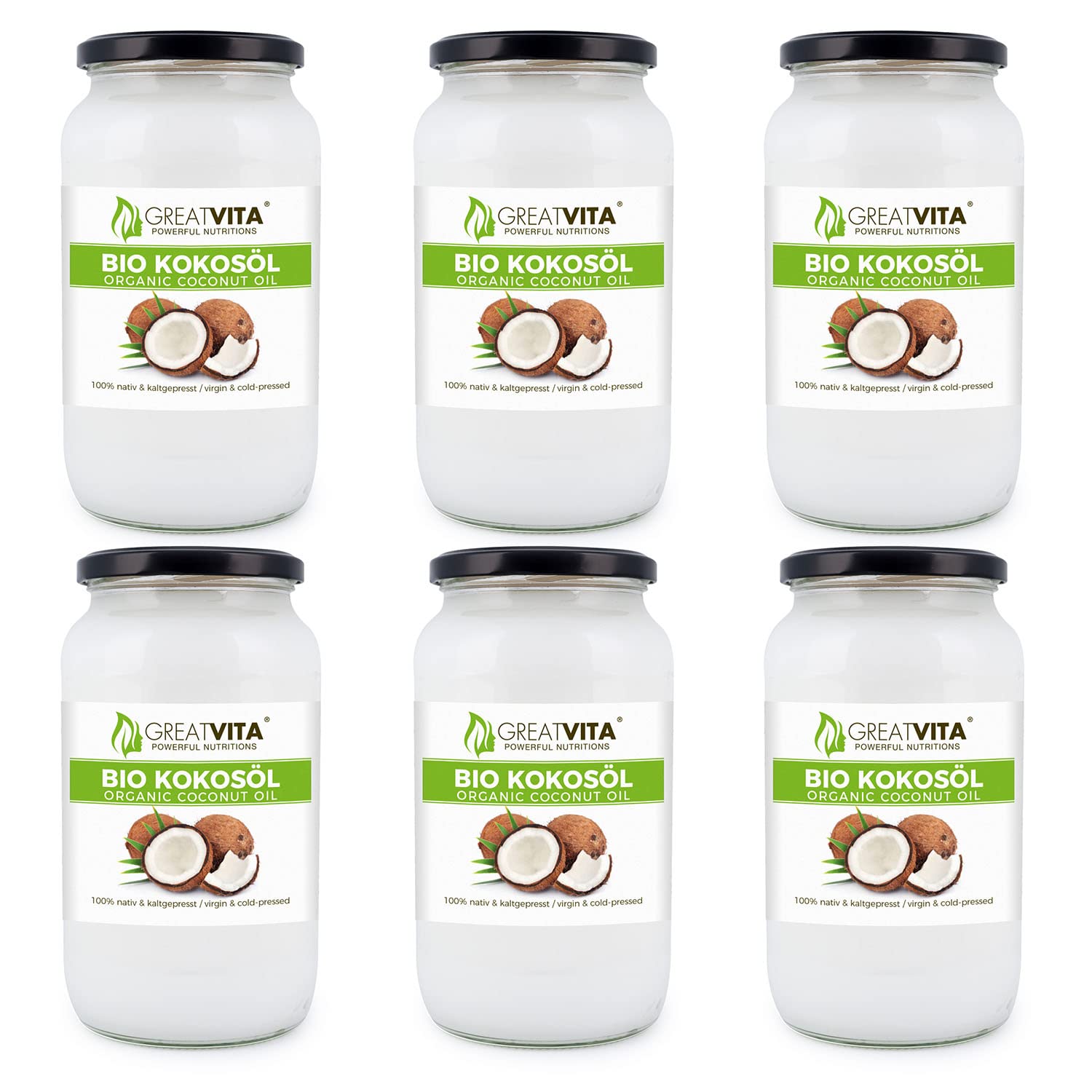 GreatVita Bio Kokosöl, nativ, (6 x 1000 ml) im Glas zum Kochen Braten Backen Hautpflege 1000 ml (6er Pack)