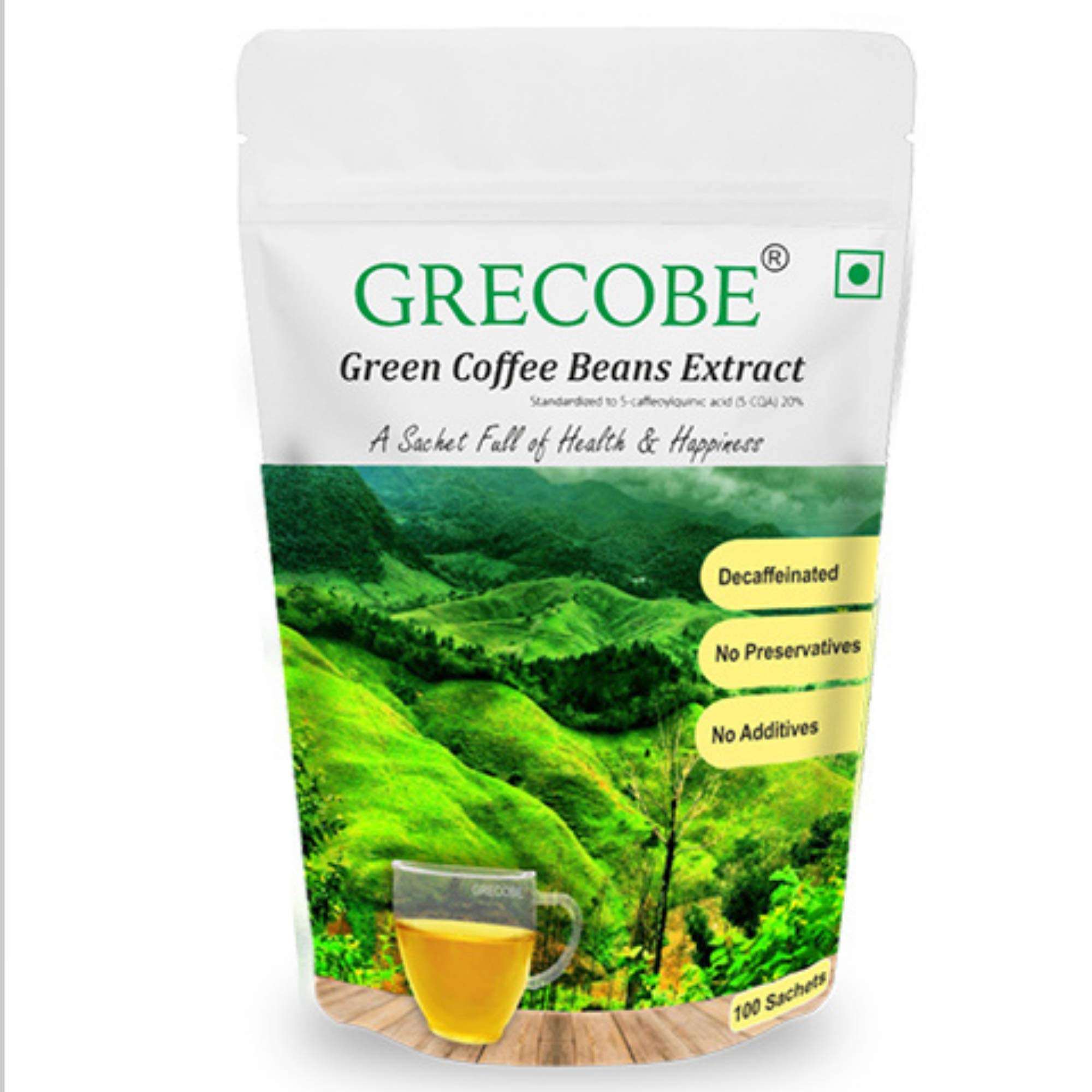 GRECOBE - 100% Pure Green Coffee Beans Extract with 50% chlorogenic acids Decaffeinated antioxidant | Maintain Metabolism - (1Pouch- 100 sachets)
