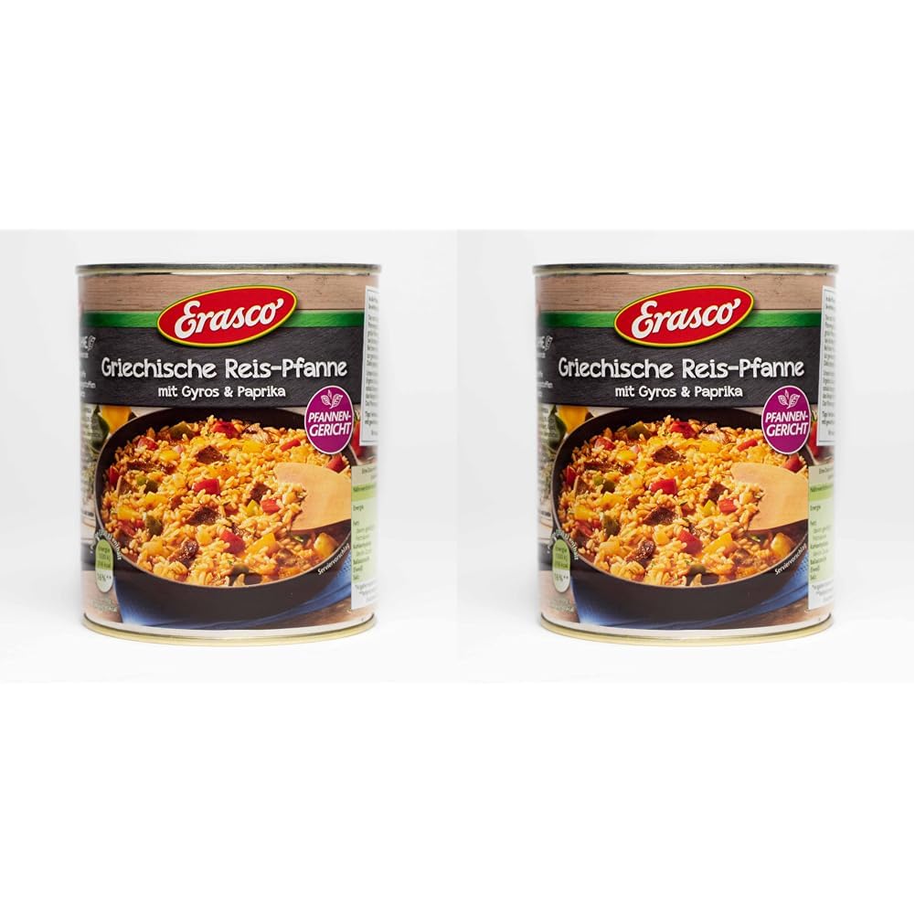 Ingredients ingredients Ingredients: 41 cooked wholemeal rice, water, 8.0 gyros (seasoned pork, partly finely crushed, rapeseed oil, potato thickness, dining salt, dextrose, coloring food: caramel sugar syrup, glucose syrup, spices, herbs, stabilizer: diphosphate), 7.4 Colorful paprika, passed tomatoes and diced tomatoes, rapeseed oil, salt, sugar, thyme, herbs of Provence, cumin, coriander, garlic powder, onion powder, dextrose, flavors, coloring paprika extract, thickener flour.Can contain traces of wheat (gluten), celery, soy, milk, egg and mustard. Instructions In the pan, done, delicious!It succeeds: Put the still half-liquid pan dish in a large pan and bring to the boil at the highest level without a lid.In high heat, let the dish cook for about 10 - 12 minutes to the desired consistency.Stir occasionally.Our recommendation for a pancastic result: take the dish from the stove as soon as the entire liquid is boiled down and the rice dish has a creamy consistency.Let the pan dish stuck for 1-2 minutes.Tip: Refine your pan dish, for example, with diced feta cheese. Warnings Not applicable MoreWith rice and spicy spices: rice, gyros and aromatic spices ensure the legendary Erasco taste - perfectly seasoned with selected herbs.Practical and close to everyday life: The delicious Greek rice pan is easily and quickly heated on the stove and thus fits perfectly into every time management.Simply and quickly finished: no time to cookWith us there is still time to eat well.No matter whether at home, at work or on the go: the Greek rice pan is always a pleasure.free of preservatives and taste-enhancing additives: Our Greek rice pan is prepared gently and carefully.A delicious pan dish doesn't need more.The following information applies to each unit per pack.INHALTSSTOFFE ZUTATEN Zutaten: 41 gekochter Vollkornreis, Wasser, 8,0 Gyros (gewürztes Schweinefleisch zum Teil fein zerkleinert, Rapsöl, Kartoffelstärke, Speisesalz, Dextrose, färbendes Lebensmittel: Karamellzuckersirup, Glukosesirup, Gewürze, Kräuter, Stabilisator: Diphosphat), 7,4 bunte Paprika, passierte Tomaten und gewürfelte Tomaten, Rapsöl, Salz, Zucker, Thymian, Kräuter der Provence, Kreuzkümmel, Koriander, Knoblauchpulver, Zwiebelpulver, Dextrose, Aromen, färbender Paprikaextrakt, Verdickungsmittel: Guarkernmehl. Kann Spuren von Weizen(Gluten), Sellerie, Soja, Milch, Ei und Senf enthalten. GEBRAUCHSANWEISUNG In die Pfanne, fertig, lecker! So einfach gelingt's:Das noch halb- flüssige Pfannengericht in eine große Pfanne geben und bei höchster Stufe ohne Deckel aufkochen lassen. Bei hoher Hitze das Gericht ca. 10 - 12 Min. bis zur gewünschten Konsitenz kochen lassen. Dabei gelegentlich umrühren. Unsere Empfehlung für ein pfanntastisches Ergebnis: Das Gericht erst vom Herd nehmen, sobald die gesamte Flüssigkeit eingekocht ist und das Reisgericht eine sämige Konsistenz hat. Das Pfannengericht 1-2 Min. ziehen lassen. Tipp: Verfeinern Sie Ihr Pfannengericht z.B. mit gewürfeltem Fetakäse. WARNHINWEISE Nicht zutreffend MehrMIT REIS UND PIKANTEN GEWÜRZEN: Reis, Gyros und aromatische Gewürze sorgen hier für für den legendären Erasco Geschmack – perfekt abgeschmeckt mit ausgewählten Kräutern. PRAKTISCH UND ALLTAGSNAH: Die leckere Griechische Reis-Pfanne wird unkompliziert und rasch auf dem Herd erhitzt und passt damit perfekt in jedes Zeitmanagment. EINFACH UND SCHNELL FERTIG: Keine Zeit zu kochenMit uns ist trotzdem Zeit, gut zu essen. Egal, ob zuhause, auf der Arbeit oder unterwegs: die Griechische Reis-Pfanne ist immer ein Hochgenuss. FREI VON KONSERVIERUNGSSTOFFEN UND GESCHMACKSVERSTÄRKENDEN ZUSATZSTOFFEN: Unsere Griechische Reis-Pfanne wird schonend und sorgfältig zubereitet. Mehr braucht ein leckeres Pfannengericht nicht. Die folgenden Informationen gelten für jede Einheit pro Packung.Griechische Reis-Pfanne (800g) - Schnelle und unkomplizierte Zubereitung – Einfach in die Pfanne geben - Mit gutem Gemüse - Richtig lecker (Packung mit 2) 800 g (2er Pack)