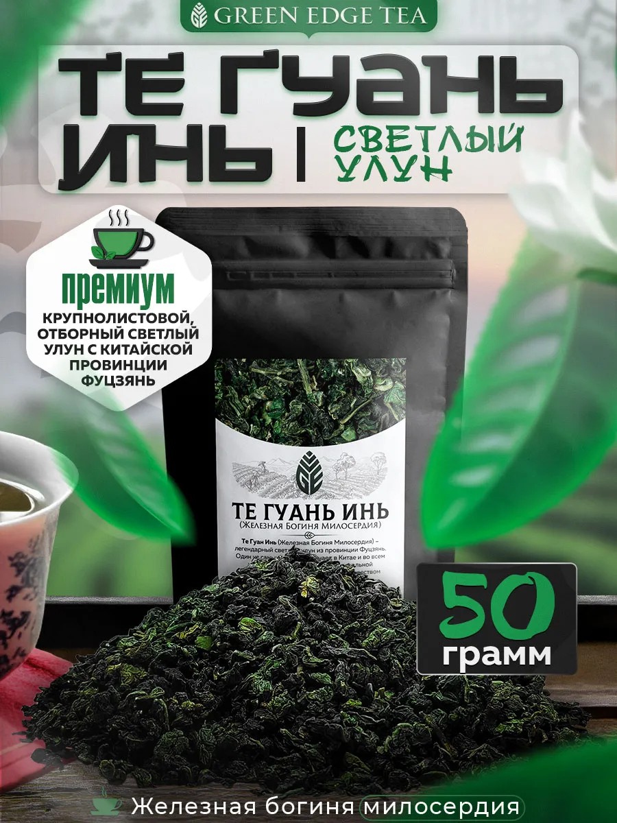 Те Гуань Инь (Железная Богиня Милосердия) от компании Green Edge Tea - это настоящий китайский листовой чай, который производится только в провинции Аньхой. Тегуаньинь долго сохраняет свой вкус, поэтому подходит для многократного заваривания. В сухом виде Те Гуань Инь представляет собой мелкие комочки зеленоватого оттенка. Для заваренного напитка характерен ярко выраженный цветочно-травяной аромат и приятный сладковатый вкус. Первоначальный желтоватый оттенок с бирюзовым отливом по мере заваривания меняет свой цвет на более тёмный.